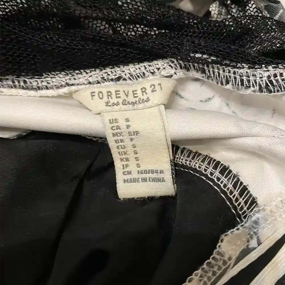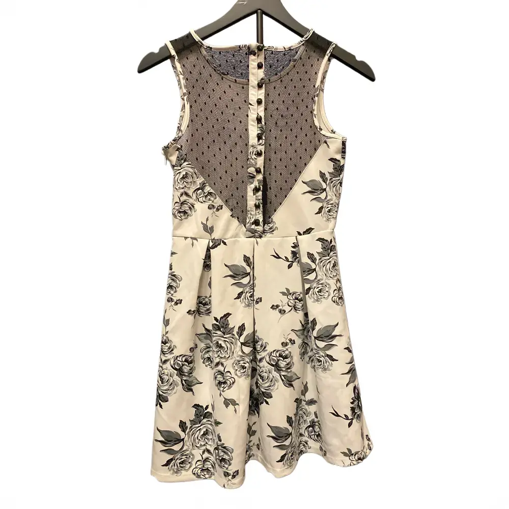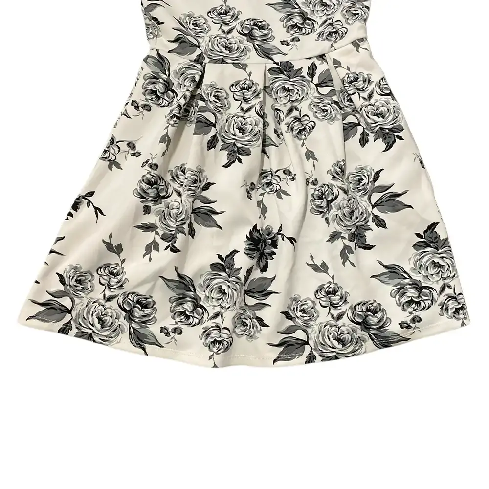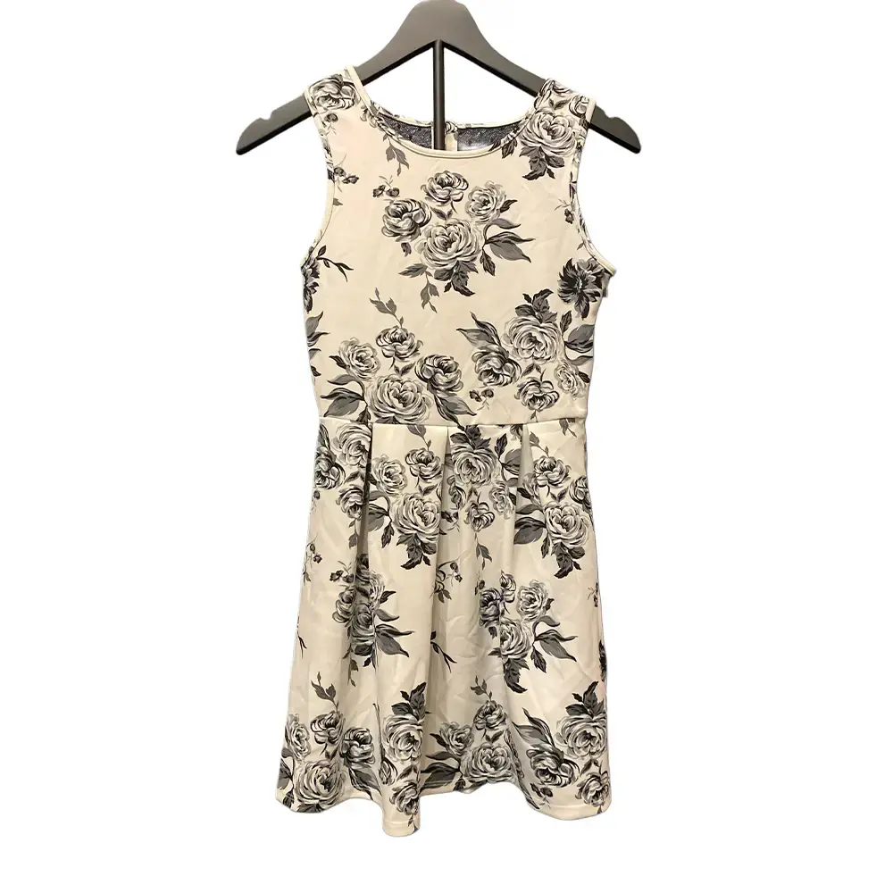 This Forever 21 girls dress has a sweet fit and flare shape with a soft white base and allover black and gray rose print. The sleeveless bodice features a classic boat neckline in front and a sheer dotted mesh panel in the back with decorative buttons for a modern twist. The skirt is gently pleated for extra movement and is fully lined in black for comfortable coverage.