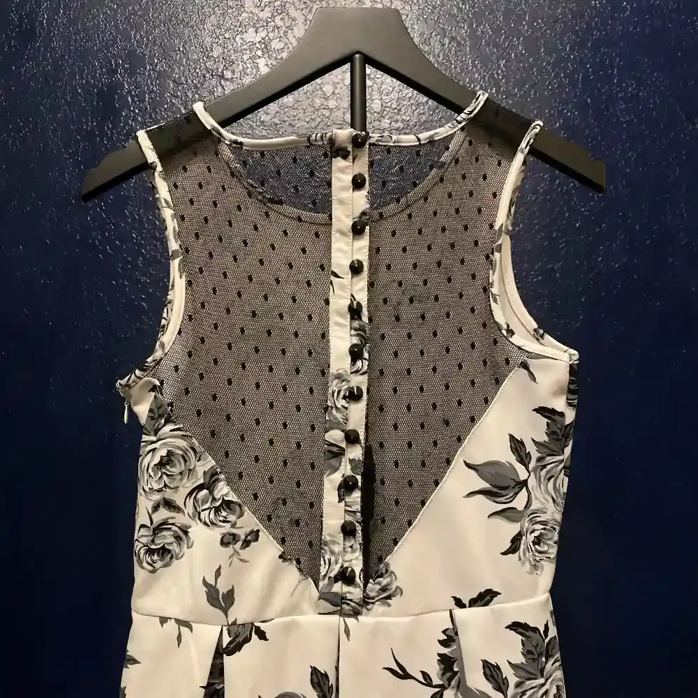 Details: Pleated skirt decorative back buttons sheer mesh panel