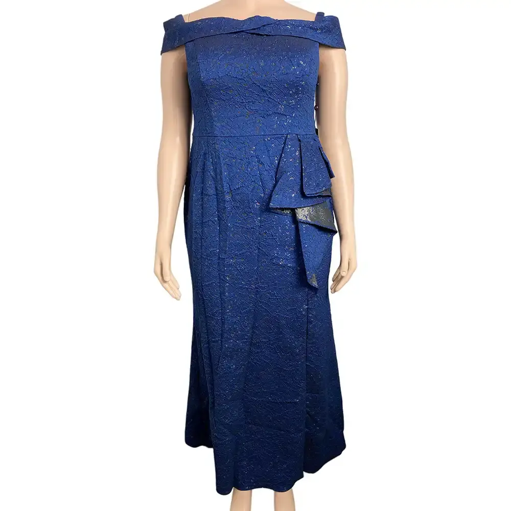 The fabric has a gorgeous crinkled, shimmery texture in a deep, rich navy that photographs beautifully and looks even better in person. It's the kind of fabric that moves and drapes elegantly, creating visual interest without being busy. The real showstopper is the asymmetrical ruffle detail at the waist with its metallic accent—it's unexpected and chic, giving the dress movement and a contemporary twist. The zipper back closure ensures a smooth, secure fit.