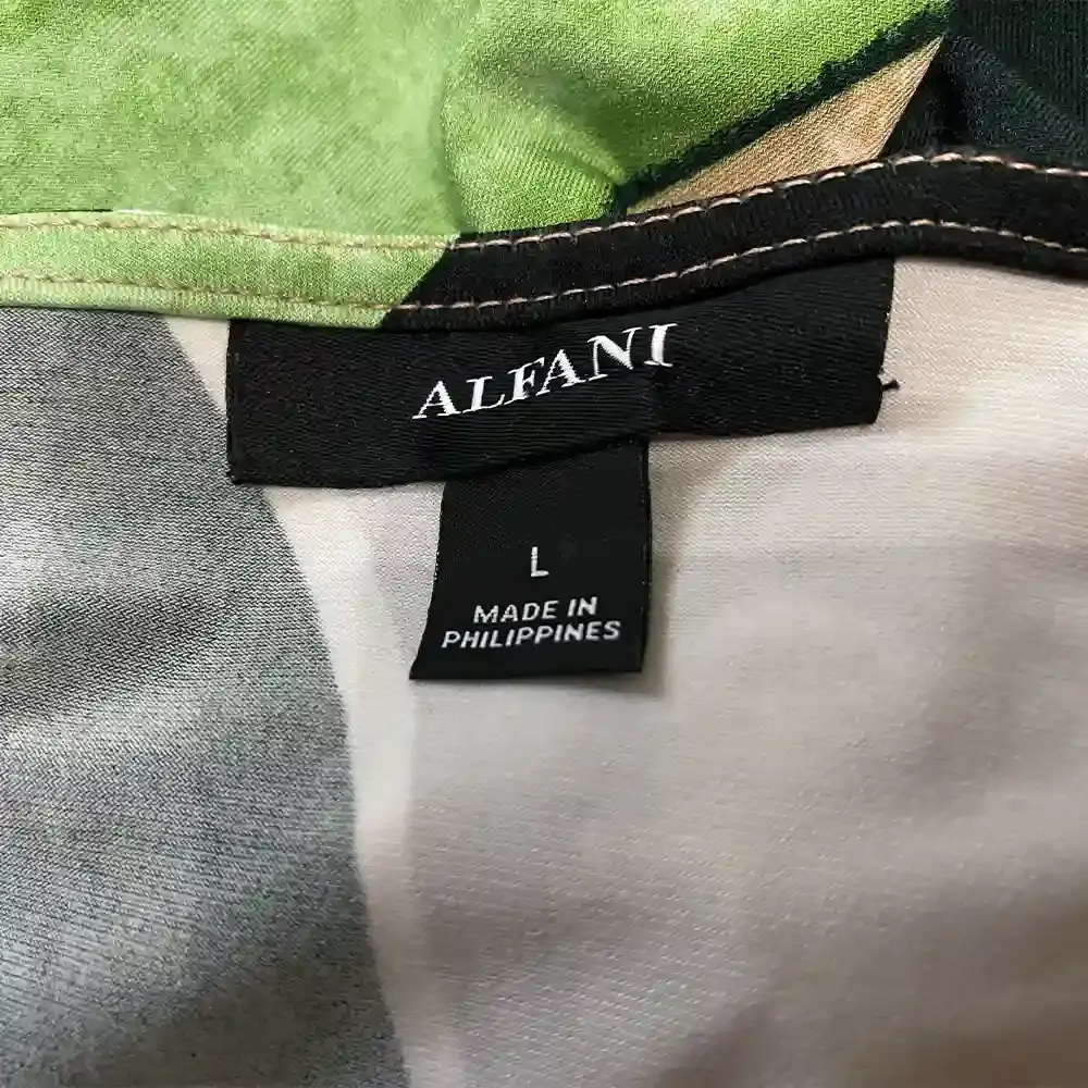 Make a statement with this stunning Alfani tunic that's pure wearable art. The bold abstract pattern features flowing wavy stripes in a sophisticated color palette of emerald green, soft pink, deep black, and neutral beige with white accents, creating dynamic visual movement. The flattering boat neckline showcases the shoulders beautifully, while the comfortable 3/4 sleeves offer versatile coverage. Crafted from a soft polyester-spandex blend, this tunic provides stretch and comfort while maintaining its shape. The relaxed tunic length is perfect for pairing with leggings, skinny jeans, or trousers, offering flattering coverage and easy, stylish wear. This piece brings that perfect retro-modern vibe - think 60s mod meets contemporary chic. Whether you're heading to an art gallery opening, brunch with friends, or just want to add some personality to your everyday style, this tunic delivers sophisticated impact. Pre-loved and ready to turn heads.