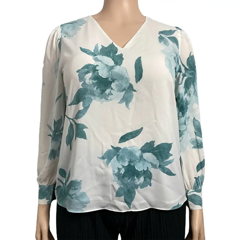 Add a touch of sophistication to your wardrobe with this beautiful Alfani blouse. The crisp white backdrop showcases stunning watercolor-style florals in gorgeous shades of teal, turquoise, and soft blue that create an artistic, painterly effect. The flattering V-neckline elongates the silhouette, while the long sleeves feature delicate gathered cuffs and subtle shoulder gathering for a feminine touch. The lightweight, fully lined polyester fabric drapes beautifully and moves gracefully with you. Perfect for the office, special occasions, or elevated everyday wear. Pair with dress pants for work or tuck into a skirt for a more dressed-up vibe. This piece is new with tags but may show minimal signs of store try-ons.