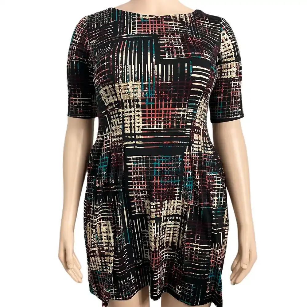 A polished petite dress that moves with you. This Connected Apparel style features a modern abstract grid print in black with cream, teal, and burgundy accents. The fit and flare silhouette skims the waist and falls above the knee for an easy, flattering shape. A soft stretch knit adds comfort while the full lining creates a smooth finish. Elbow sleeves and a round neckline keep it versatile for work, dinner, or events. Finished with a back zipper and two hidden pockets, one on each side.