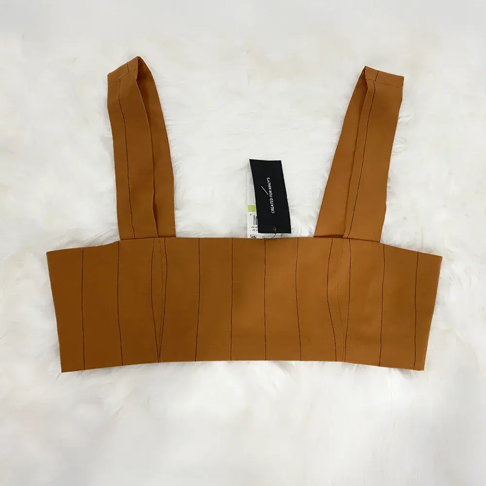 Make a statement with this gorgeous Danielle Bernstein crop top that's equal parts sophisticated and sexy. The rich caramel color is universally flattering and on-trend, while the vertical pintuck seaming creates a structured, corset-inspired look that sculpts and defines your silhouette. The square neckline and wide supportive straps offer a modern, balanced aesthetic, while the low scoop back adds an unexpected detail. Fully lined for comfort and coverage, this piece features a discreet side zipper closure for a seamless look. The cropped length hits right at the natural waist, making it perfect for pairing with high-waisted jeans, skirts, or trousers. Whether you're heading to brunch, a concert, date night, or a special event, this versatile top delivers contemporary style with a touch of vintage-inspired glamour. Brand new with tags attached and ready to turn heads.