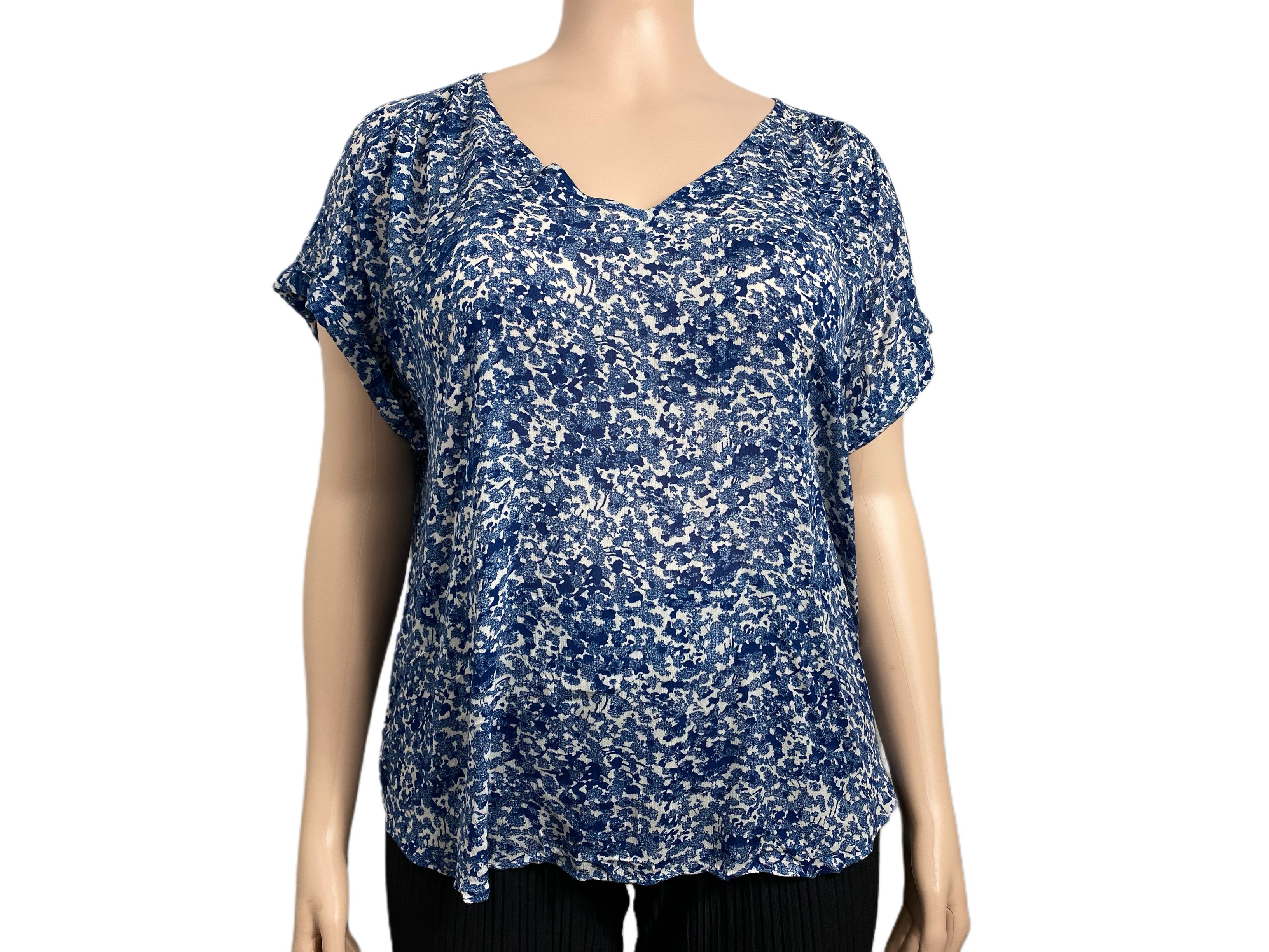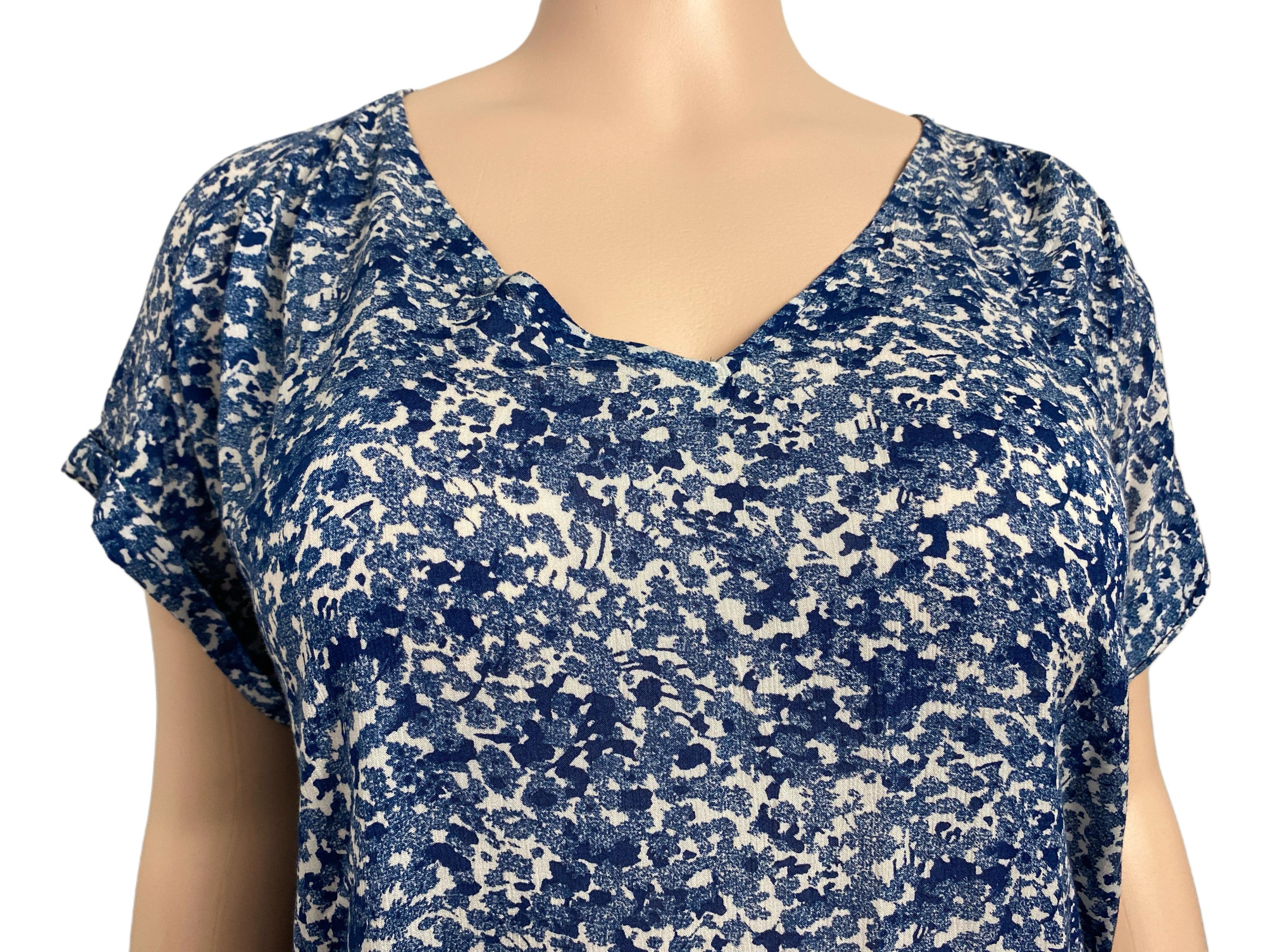Add artistic flair to your wardrobe with this stunning DKNY Jeans top featuring an eye-catching abstract paint splatter print in rich blue and white. The flattering V-neckline creates an elegant silhouette, while the charming keyhole detail at the back adds an unexpected touch of sophistication. Crafted from 100% viscose, this top offers a luxuriously soft, drapey feel that moves beautifully with you. The relaxed fit and rolled short sleeves create an effortlessly stylish look perfect for casual days or dressed-up occasions. The abstract pattern adds visual interest and pairs easily with solid-colored bottoms. Versatile enough for the office, weekend brunch, or evening outings - simply style with jeans, trousers, or a skirt. Brand new with tags attached and ready to elevate your everyday style with DKNY's signature urban sophistication.