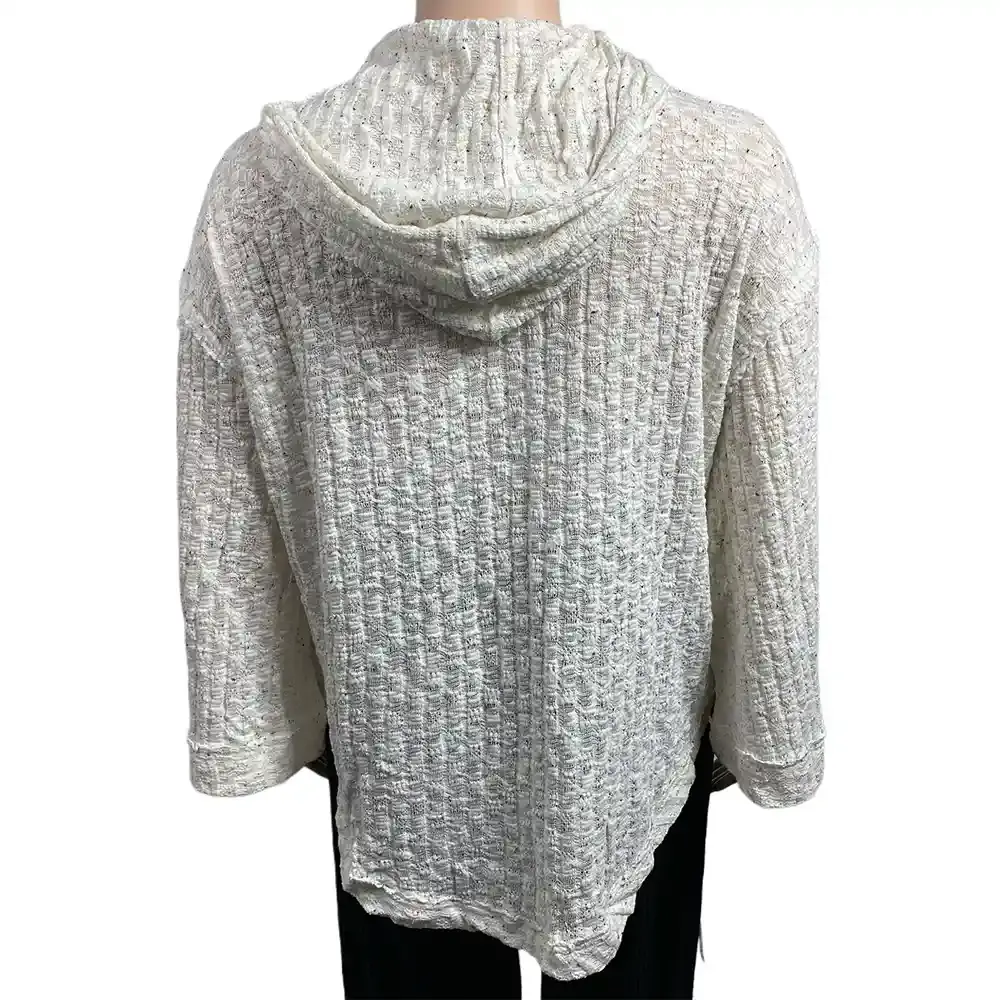 Embrace laid-back bohemian style with this charming Free People Baja Babe oversized hoodie sweater. Crafted in a lightweight hacci knit, this cream-colored beauty is adorned with vibrant confetti-like speckles in pink, blue, yellow, and other cheerful hues that add a playful, artistic touch. The relaxed, oversized silhouette drapes beautifully for an easygoing vibe, while the cozy hood with drawstring and V-neckline opening create the perfect casual-cool aesthetic. The soft, breathable fabric makes this ideal for layering or wearing solo during transitional seasons. Whether you're headed to a festival, weekend brunch, or just living that free-spirited lifestyle, this sweater delivers signature Free People charm. New with tag and ready to add some bohemian magic to your wardrobe.