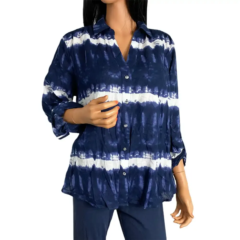 Embrace laid-back bohemian style with this trendy INC International Concepts tie-dye utility shirt. The striking horizontal shibori-inspired pattern in rich navy and crisp white creates bold visual impact that stands out from the crowd. This versatile button-front shirt features a classic point collar and long sleeves with convenient roll-tab detailing, allowing you to adjust the sleeve length for different looks and comfort. Crafted from 100% cotton, this shirt offers breathable, all-day comfort with a relaxed fit that flatters every body type. The hip-length cut pairs perfectly with jeans, shorts, or leggings for endless styling options. Whether you're heading to a casual weekend outing, music festival, or just want to add some personality to your everyday wardrobe, this shirt delivers that perfect blend of boho chic and timeless appeal. Created for Macy's with quality and style in mind.