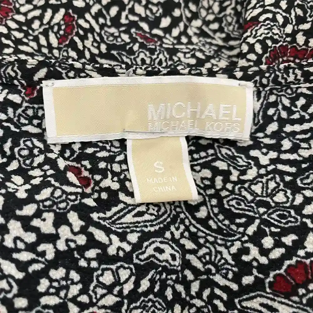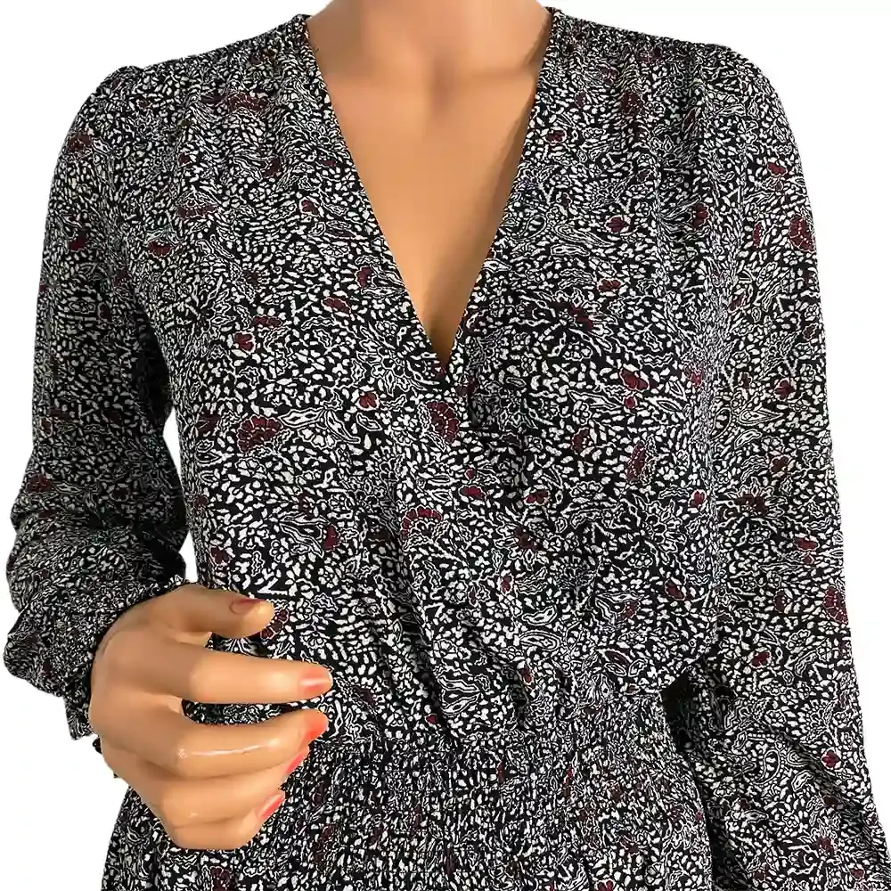 This Michael Kors dress is giving timeless elegance with a modern twist. The faux-wrap silhouette is a masterclass in flattery—it cinches at the waist to define your shape while the flowing skirt drapes beautifully and moves with you. The black crepe fabric is covered in an intricate floral-inspired pattern with rich maroon accents that add visual interest without being loud or overwhelming. It's the kind of sophisticated print that works equally well for a dinner party or a day at the office.