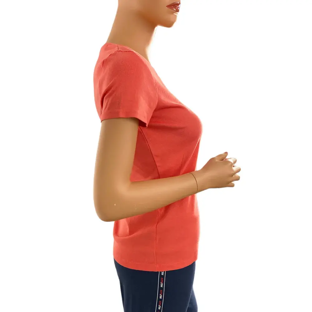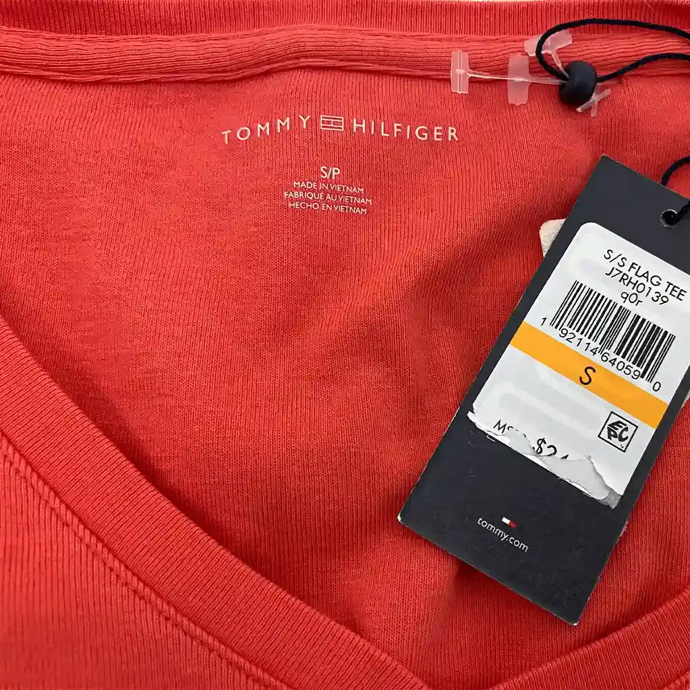 Add a pop of color to your wardrobe with this iconic Tommy Hilfiger Flag Tee in a gorgeous coral orange shade. This classic V-neck tee features the signature Tommy flag logo embroidered at the chest, bringing that instantly recognizable preppy aesthetic. Made from soft, breathable 100% cotton, this tee offers all-day comfort and easy care. The flattering V-neckline and relaxed fit make it perfect for casual days, while the vibrant color adds personality to any outfit. Pair with jeans, shorts, or layer under a blazer for versatile styling. This piece is brand new with tags but shows minor soiling and wear from store try-ons. A wardrobe staple from a trusted American classic brand.