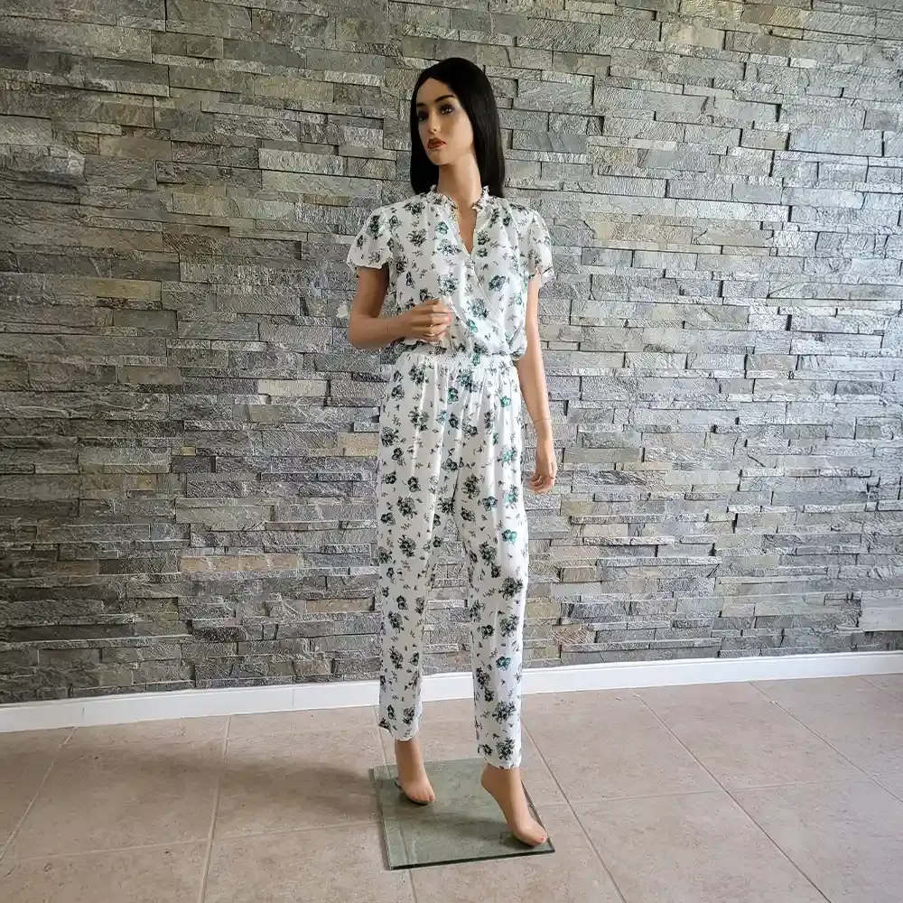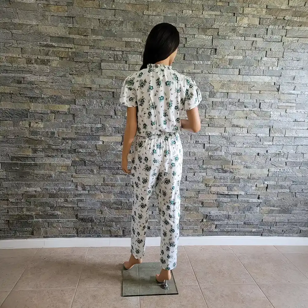 This 1.STATE jumpsuit makes getting dressed easy. One piece and you're done. The white background with scattered teal florals feels fresh and feminine, while the surplice neckline and flutter sleeves add just enough detail without being overdone. The smocked elastic waist gives you shape and comfort, and the side pockets are actually functional. Tapered leg hits at the ankle for a clean look.