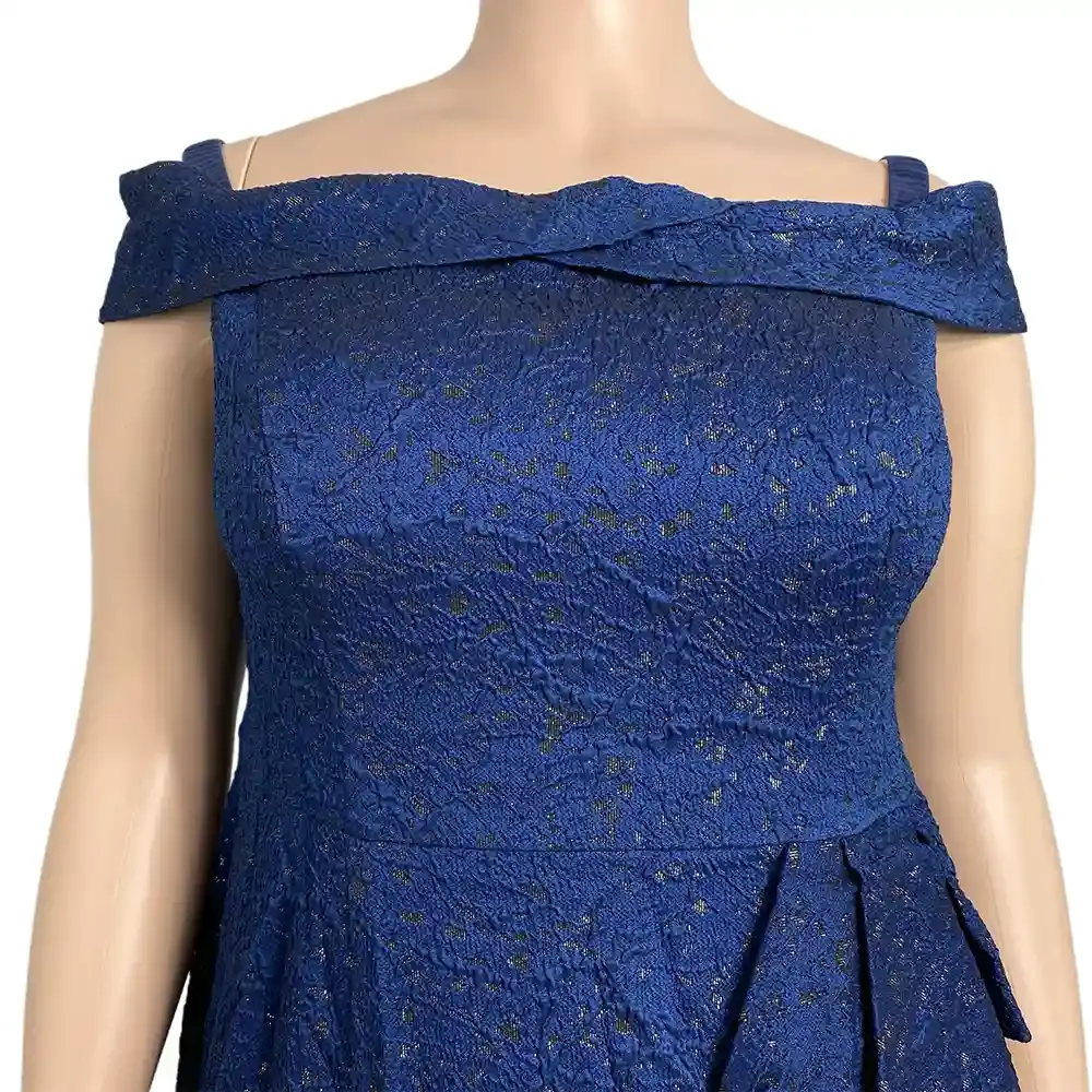 This Adrianna Papell dress is textbook elegance with a modern edge. The off-shoulder neckline with its signature bow detail is incredibly flattering—it frames the collarbone beautifully while keeping things refined and polished. The back features a deep V-cut that adds just enough intrigue without being too daring. This is a dress that knows how to balance sophistication with personality.