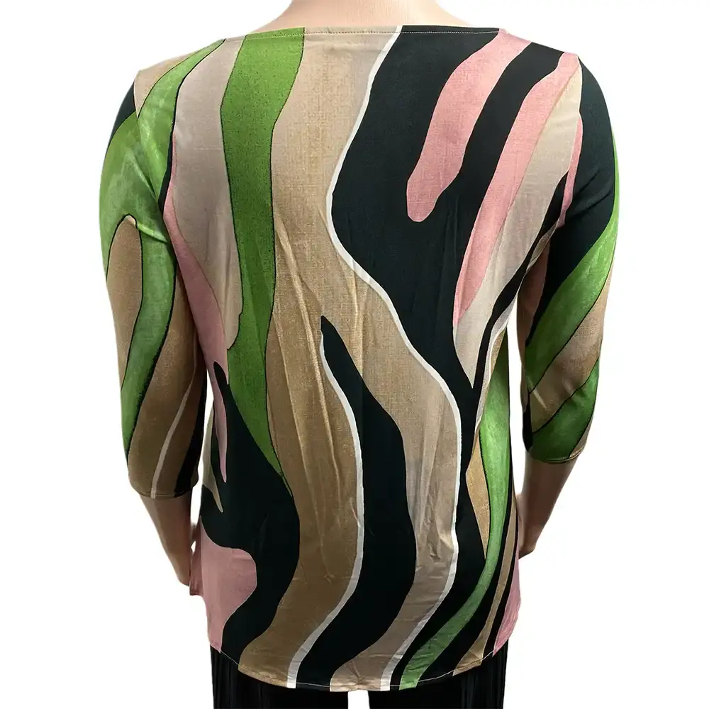 Make a statement with this stunning Alfani tunic that's pure wearable art. The bold abstract pattern features flowing wavy stripes in a sophisticated color palette of emerald green, soft pink, deep black, and neutral beige with white accents, creating dynamic visual movement. The flattering boat neckline showcases the shoulders beautifully, while the comfortable 3/4 sleeves offer versatile coverage. Crafted from a soft polyester-spandex blend, this tunic provides stretch and comfort while maintaining its shape. The relaxed tunic length is perfect for pairing with leggings, skinny jeans, or trousers, offering flattering coverage and easy, stylish wear. This piece brings that perfect retro-modern vibe - think 60s mod meets contemporary chic. Whether you're heading to an art gallery opening, brunch with friends, or just want to add some personality to your everyday style, this tunic delivers sophisticated impact. Pre-loved and ready to turn heads.