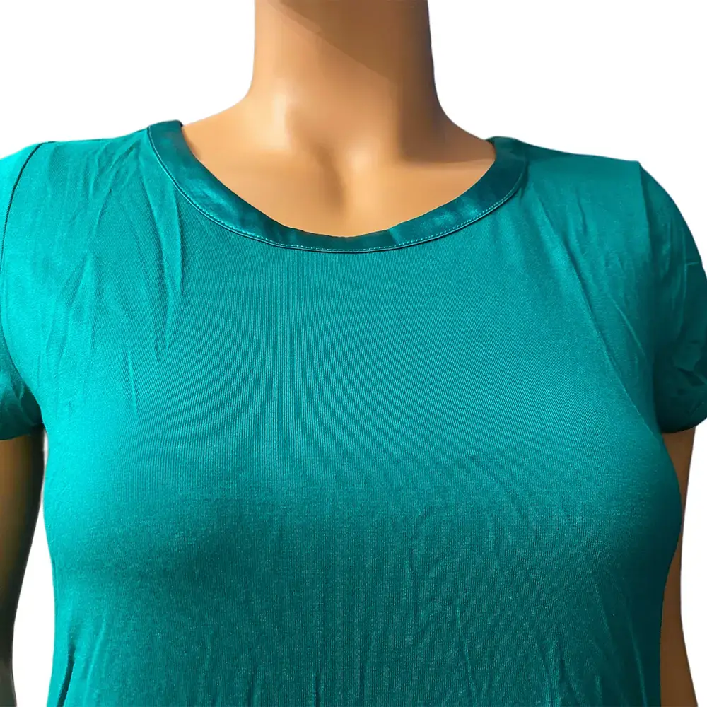 This Alfani petite tee elevates your basics with subtle luxe details. The rich teal green shade pairs with everything while the satin trim at the scoop neckline adds a polished touch. Short sleeves and an easy relaxed fit keep it comfortable for everyday wear. The modern high low hem hits at the hip in front and dips longer in the back for flattering coverage. Soft rayon blend fabric drapes beautifully and has just enough stretch. Store return in excellent condition with no flaws.