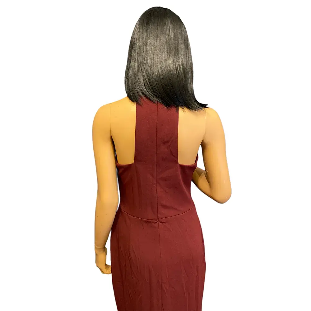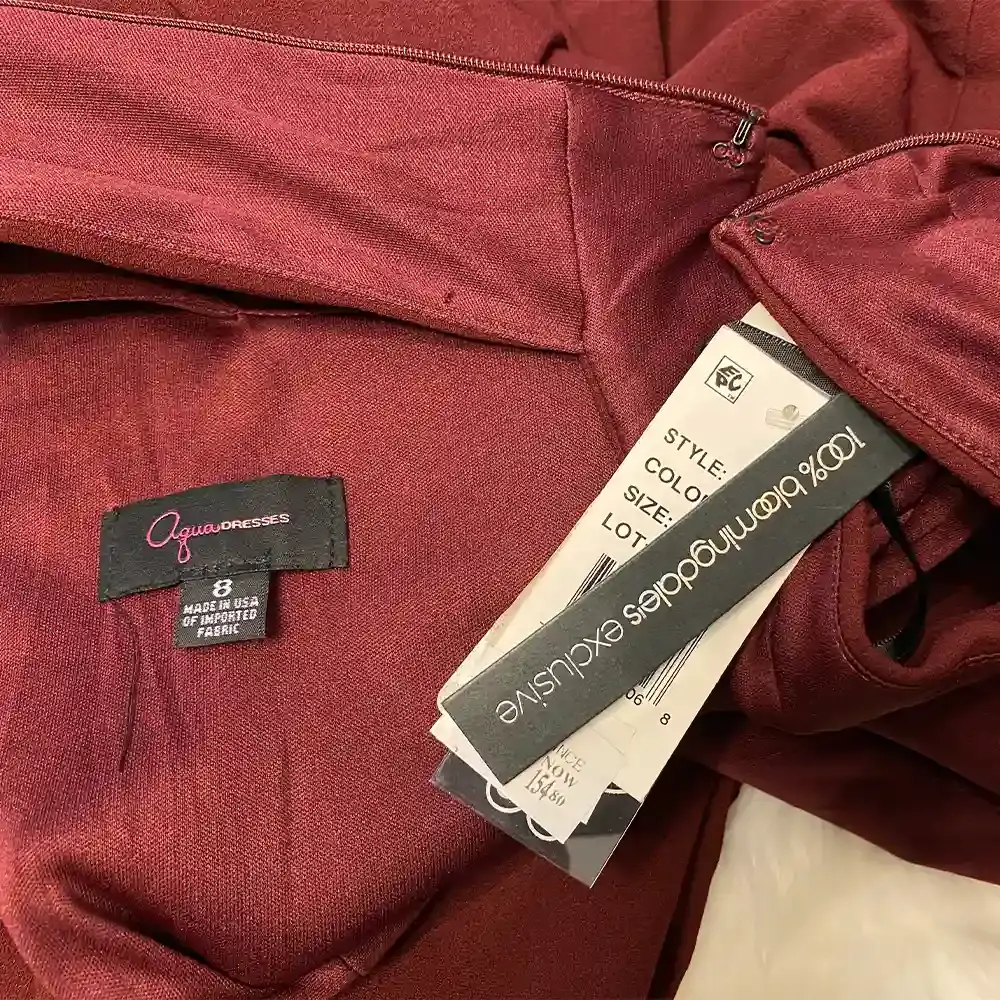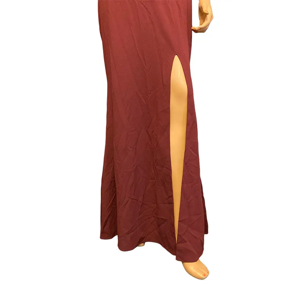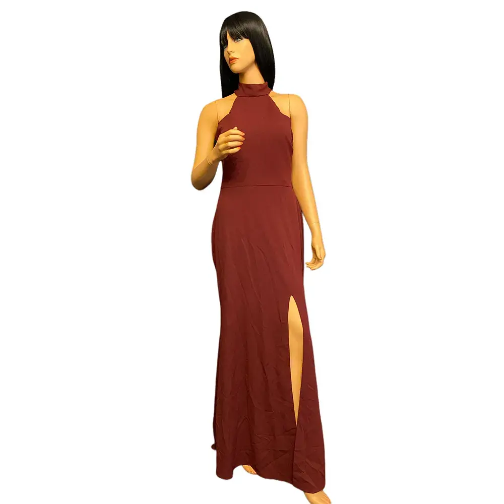 This burgundy Aqua gown features a sleek halter neckline and racerback design. The fitted silhouette flows into a floor length skirt with high side slit and flared bottom. Includes padded cups for support and is fully lined. Hidden back zipper closure. Brand new with original tags attached. Note: fabric care tag is missing.