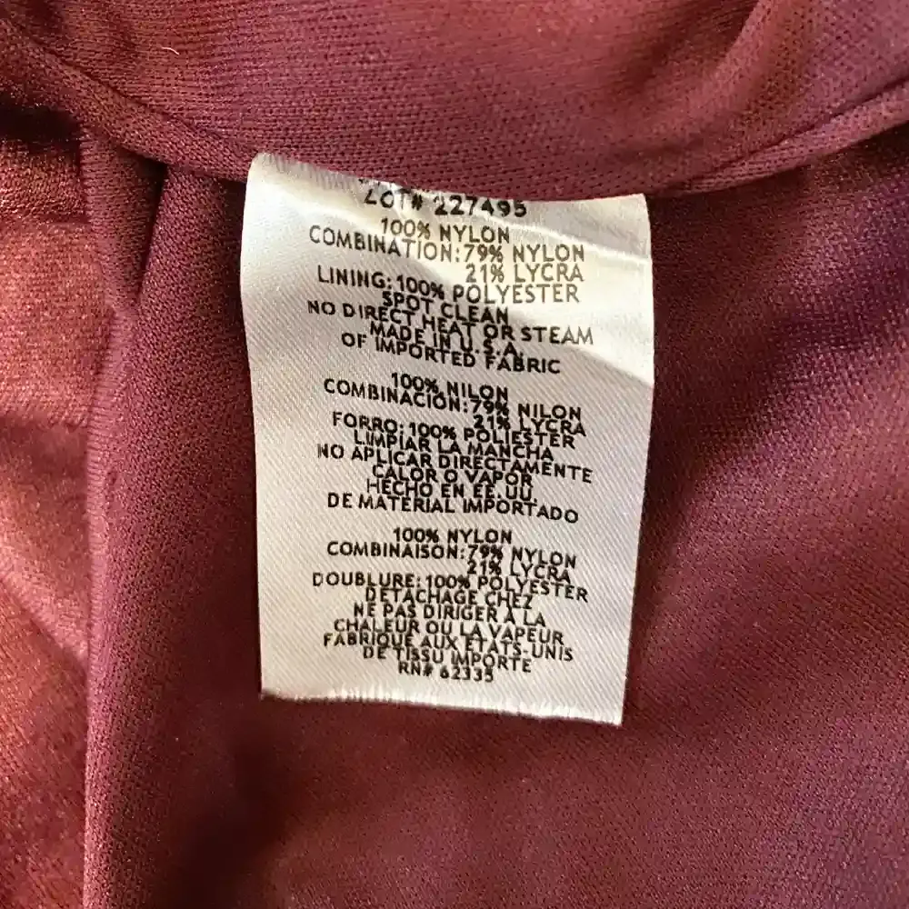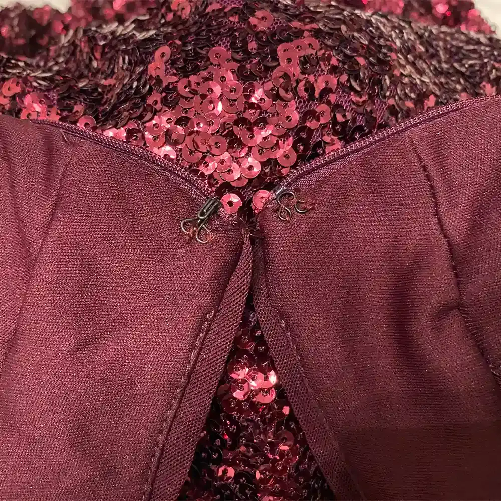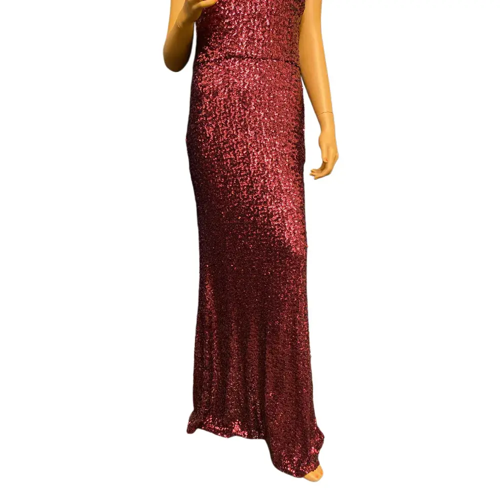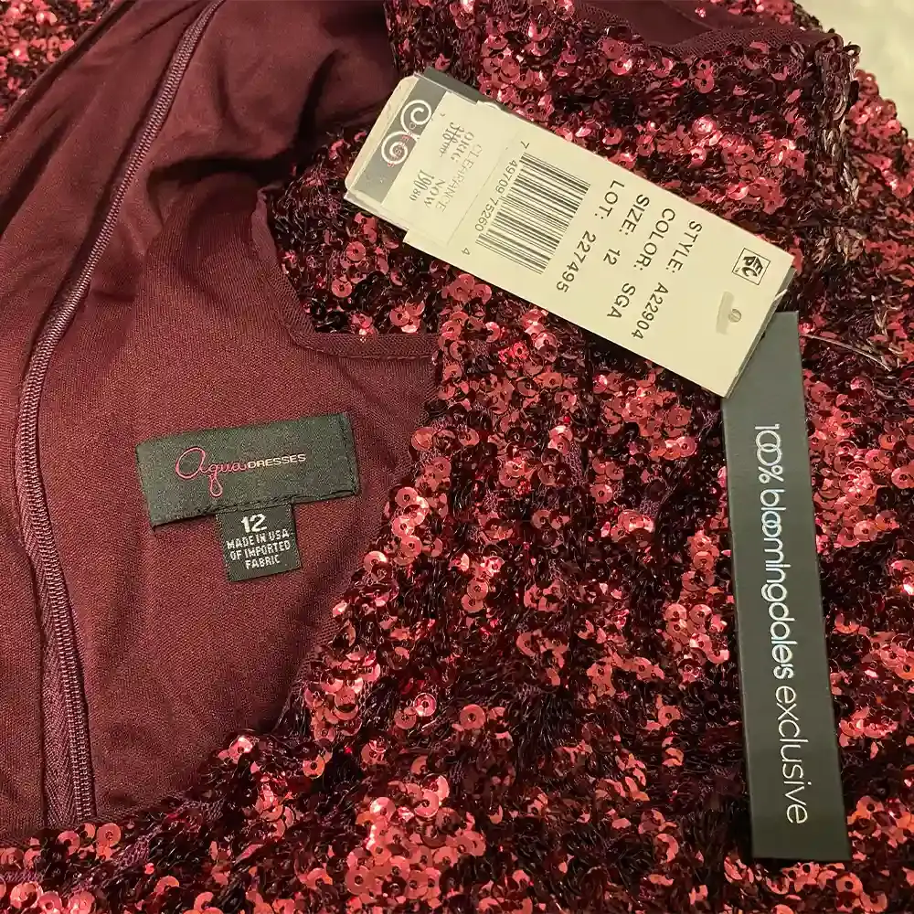 This dazzling Aqua gown is covered head to toe in burgundy sequins that catch the light beautifully. The high halter neckline and racerback design create a sleek, modern silhouette. Floor length with fitted shaping and full lining throughout. Hidden back zipper closure. Brand new with original tags attached.