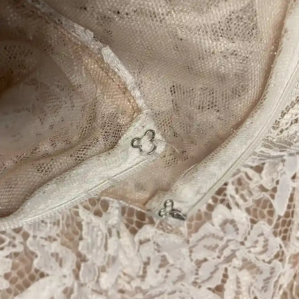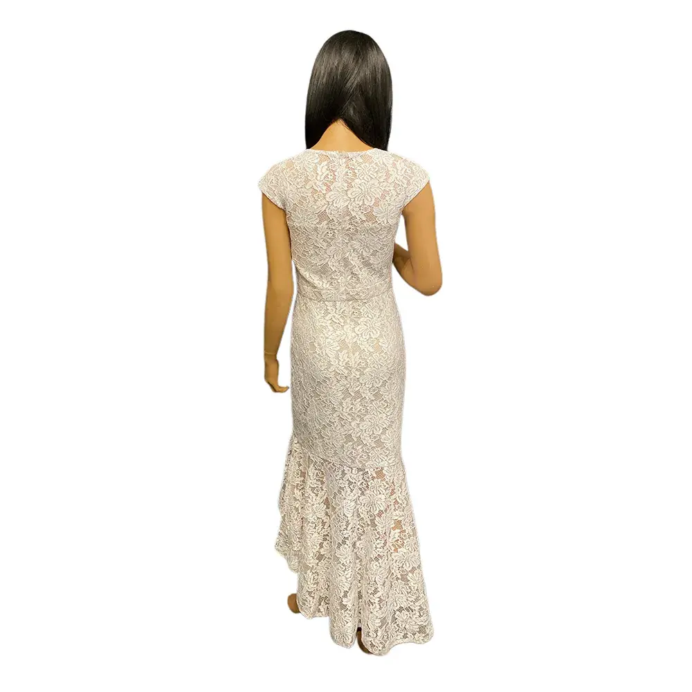A dress that works for weddings, showers, or any event where you need to look polished. The all-over floral lace has a romantic feel without being over the top. Cap sleeves keep it modest, and the fitted bodice through the waist gives you shape before flaring out into a high-low trumpet hem. The back zipper sits flat and the lining underneath means you don't have to worry about what shows through the lace.