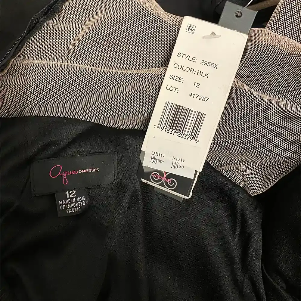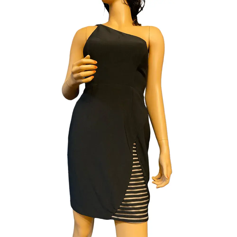 This Aqua dress delivers head turning style with its sophisticated one shoulder silhouette and modern details. The asymmetrical neckline creates a striking diagonal line across the bodice while leaving one shoulder bare for dramatic effect. Fitted sheath construction hugs curves beautifully through the body. The tulip wrap hem features a peek of striped mesh panel at the front for unexpected edge. Turn around to reveal a sexy open back design with two delicate spaghetti straps that cross elegantly. A matching striped mesh panel spans the upper back waist adding continuity to the design. Built in padded cups provide support without needing a bra. Full lining ensures comfort and opacity. Back zipper closure creates smooth lines. Stretch fabric blend moves with you on the dance floor. Perfect for cocktail parties, date nights, club wear, or any occasion calling for a standout little black dress. Brand new with original tags attached.