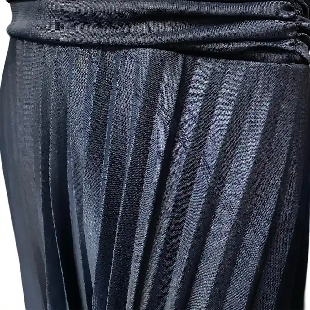 Elegant B. Darlin evening gown in navy blue featuring beaded illusion halter bodice with rhinestones and sequins, plus flowing pleated maxi skirt. Store try-on condition with minor imperfections.