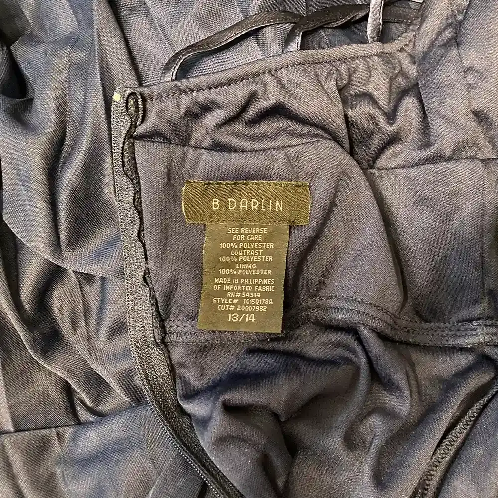 This stunning B. Darlin gown features an eye-catching illusion halter neckline embellished with rhinestones and sequins that catch the light beautifully. The sweetheart neckline at the bust creates a flattering shape while molded cups provide built-in support. Strappy back detail with multiple thin straps creates a dramatic statement and ties at the nape with a button closure. Ruched waistband defines the natural waist before flowing into a graceful pleated chiffon skirt that moves beautifully. Hidden back zipper closure ensures smooth lines. Fully lined for comfort. The rich navy blue color works perfectly for formal occasions. From retail store with original tags, gently tried on with some minor imperfections.