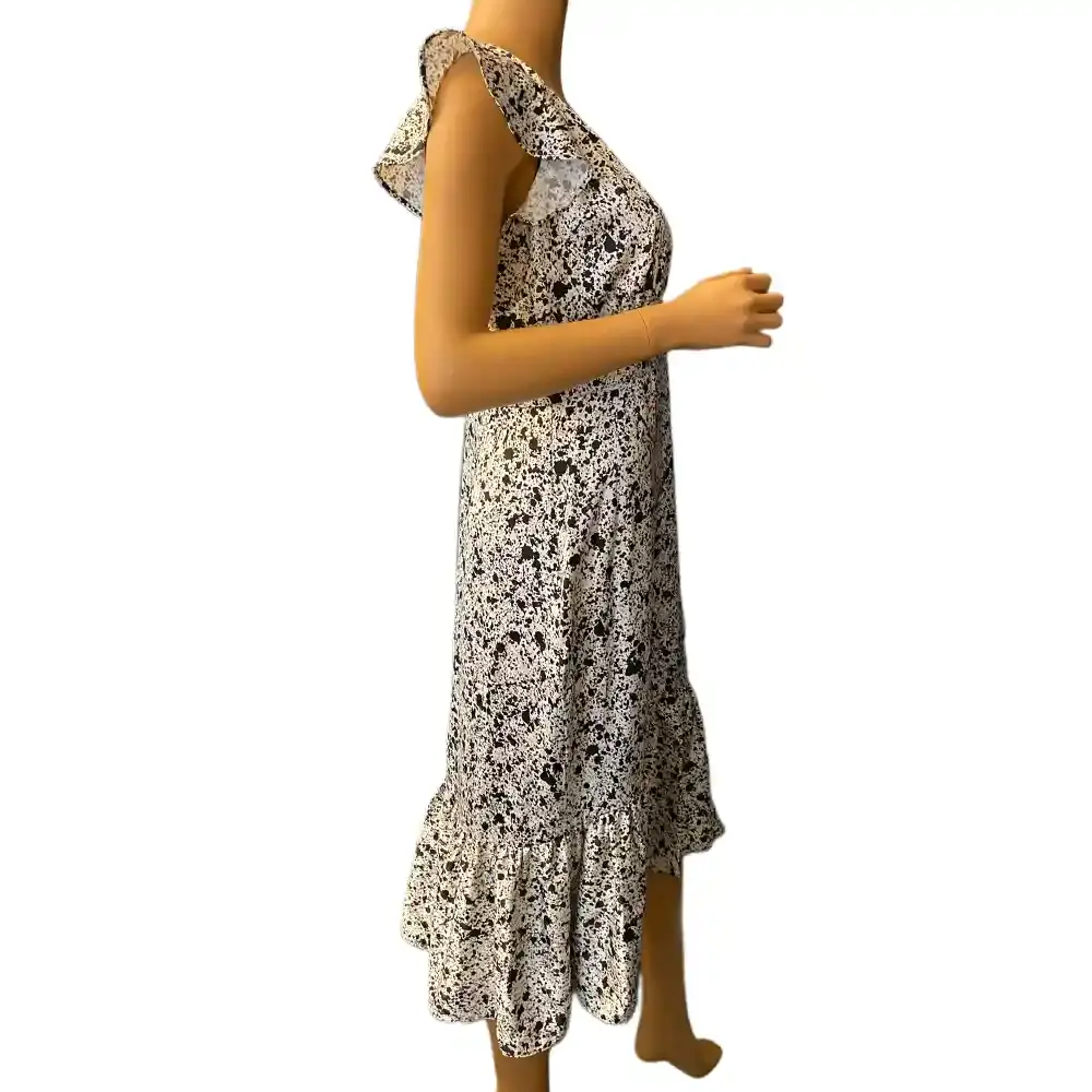 This eye catching Bar III dress features a bold black and white splatter print that makes a statement. Flutter cap sleeves add a feminine touch while the V neckline flatters. Fitted through the body with an asymmetric flounce hem that adds movement and interest. Lightweight polyester fabric drapes beautifully. Hidden side zipper closure. Brand new with original tags attached.