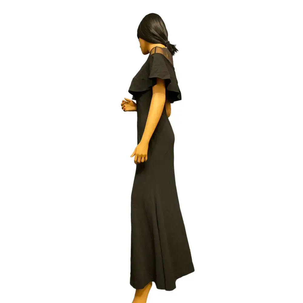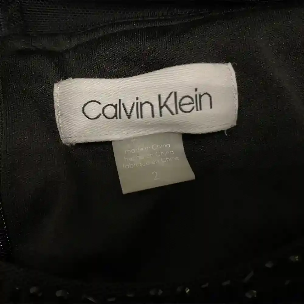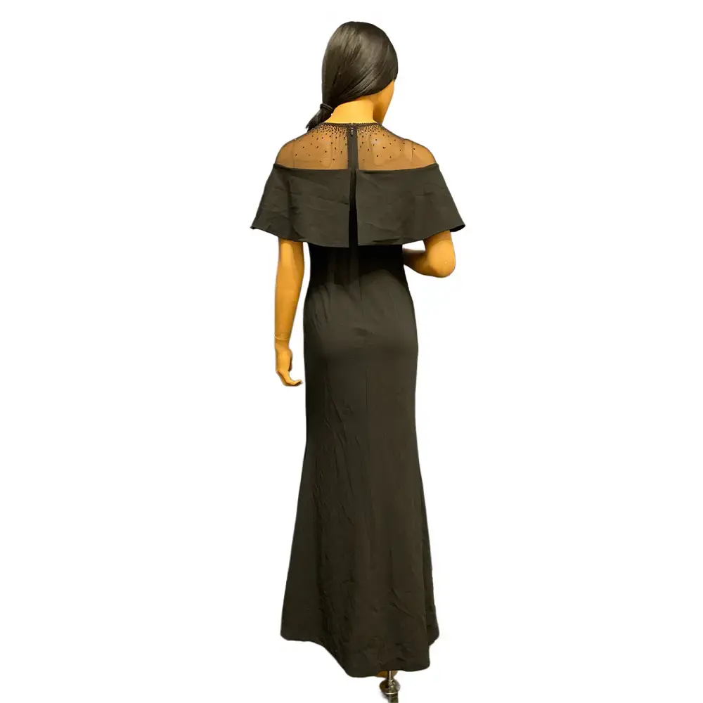 This breathtaking Calvin Klein gown brings red carpet glamour with its show-stopping design details and impeccable construction. The sophisticated illusion mesh yoke creates a high neckline adorned with scattered crystal beading that catches the light beautifully. The standout feature is the dramatic off-shoulder popover cape that drapes elegantly over the arms, creating a statement silhouette that's both modern and timeless. Beneath the cape overlay, the sleek sheath silhouette hugs curves in all the right places with structured stretch fabric that provides comfort while maintaining polished lines. The form-fitting bodice flows into a graceful floor-length skirt that creates an elongated, elegant line. Hidden back zipper closure ensures smooth lines without disrupting the dress's sleek aesthetic. The sheer beaded yoke extends across the shoulders and back, offering just a hint of allure while maintaining sophisticated coverage. Fully lined for comfort and opacity. The rich black color exudes timeless elegance and works beautifully for any formal occasion. This versatile gown transitions seamlessly from black tie galas to formal weddings, charity events to milestone celebrations. The combination of the beaded illusion neckline and dramatic cape sleeves creates unforgettable visual impact. Pair with classic heels and minimal jewelry to let this stunning piece take center stage. Made in China with Calvin Klein's renowned attention to detail and quality.