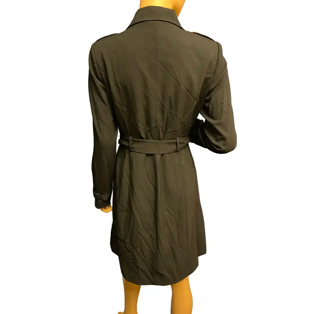 This stunning Calvin Klein coat dress brings effortless sophistication with its military-inspired design and luxe gold hardware. The double-breasted front features gleaming gold buttons that continue on the shoulder epaulettes for authentic trench coat styling. Classic notch collar and long sleeves with adjustable cuff tabs create a polished silhouette. The removable belt cinches at the waist for a flattering fit while functional side pockets add everyday practicality. Soft stretch fabric blend moves comfortably from morning meetings to evening events. The versatile dark olive tone works beautifully across seasons. Fully lined for a refined finish. Brand new with original tags attached.