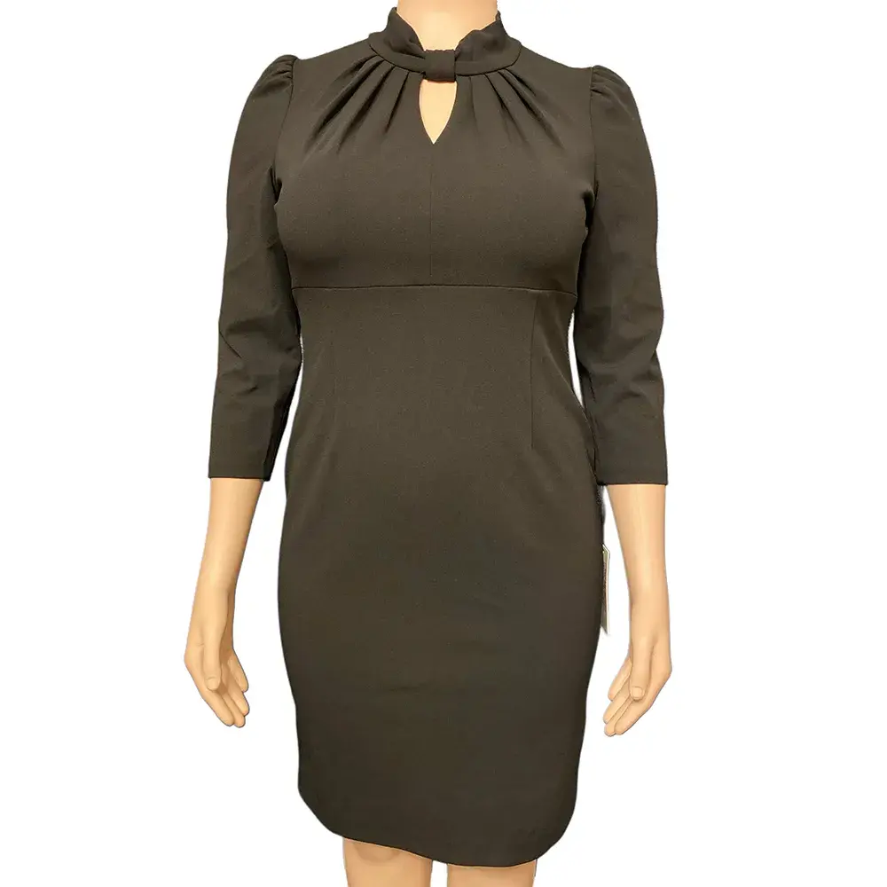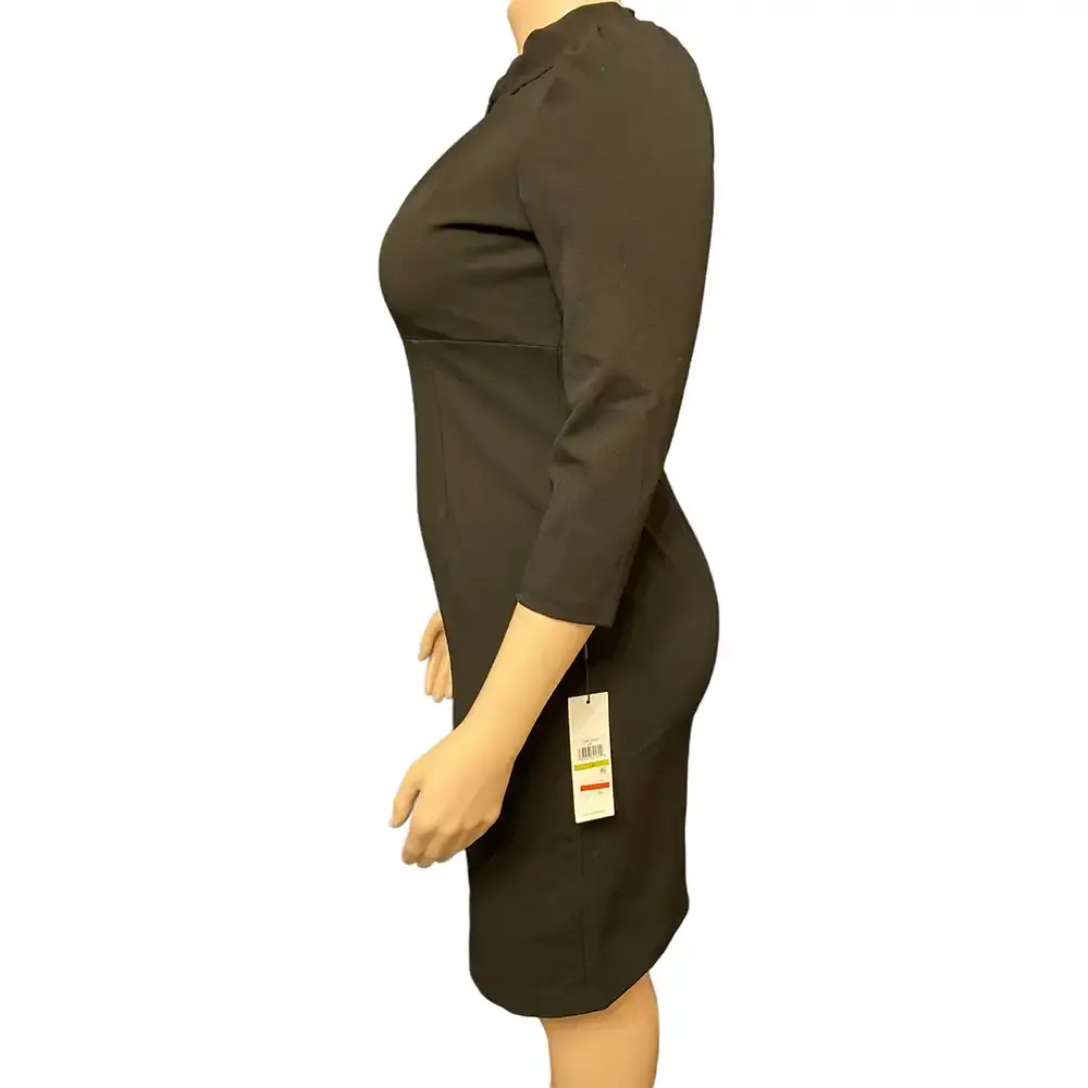 This Calvin Klein petite sheath dress offers a simple, polished look with subtle detailing. The high mock neckline is softly gathered and finished with a small tab, creating a front keyhole that adds interest without being revealing. Puff 3/4 sleeves balance the fitted sheath silhouette, designed to skim the body and flatter petite proportions. The dress falls around the knee with an approximate length of 41 inches from center back neck to hem. A hidden back zipper with hook-and-eye closure keeps the lines smooth. The stretch shell is made from a polyester and spandex blend with a partial polyester lining for added comfort. Finished in classic black, this piece works well for the office, events, or evenings out. New with original tags attached.