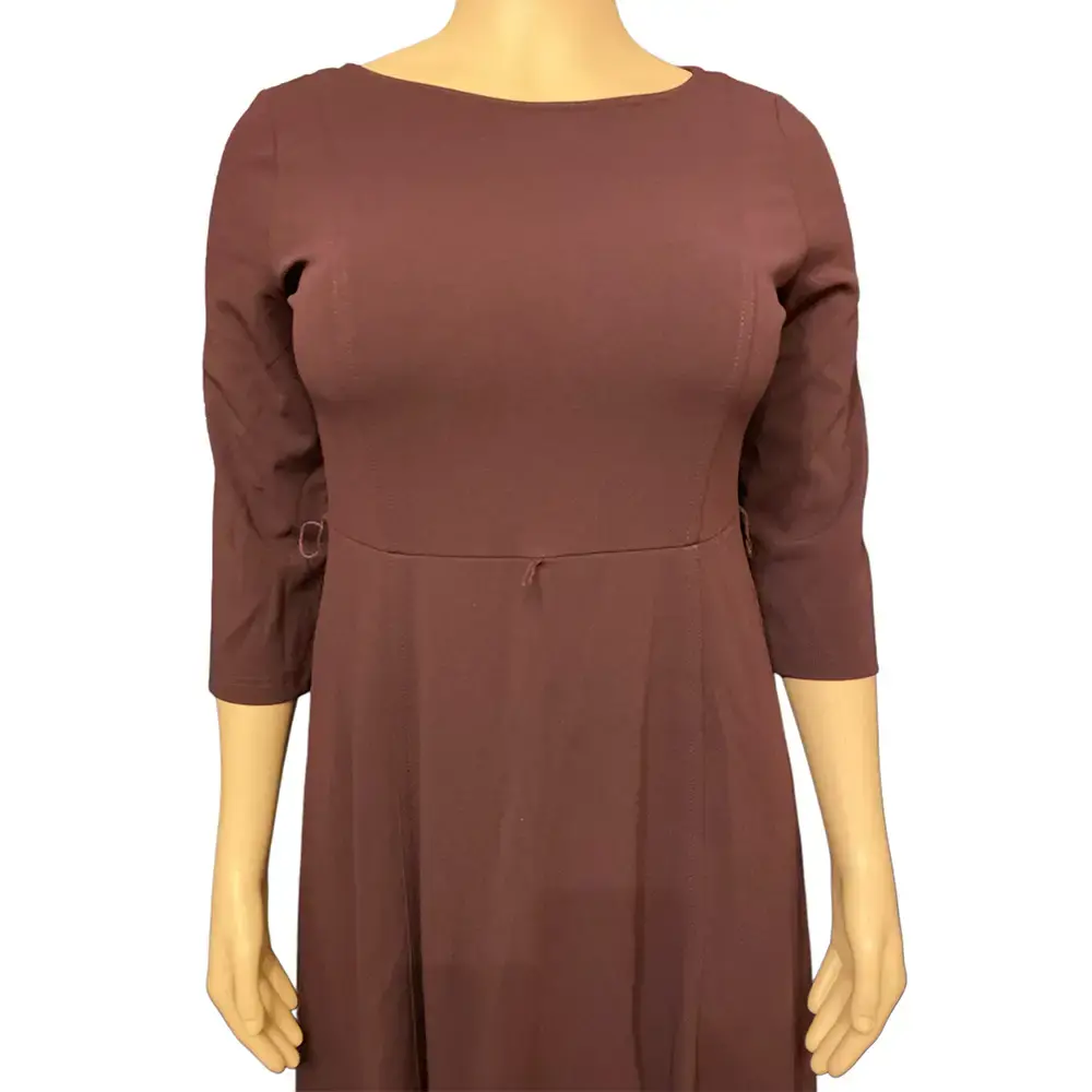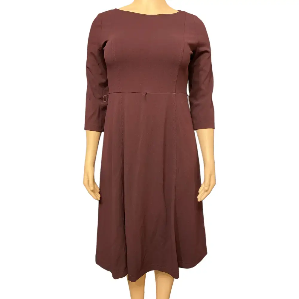 This Calvin Klein dress comes in a deep aubergine plum shade with soft stretch fabric that skims the body. The round neckline, three quarter sleeves, and softly flared skirt create a simple refined shape that works for the office, church, dinners, or special occasions. Back zipper closure.