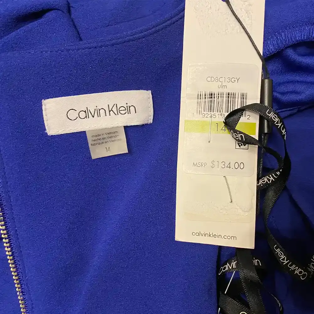 This eye-catching Calvin Klein dress makes a bold statement with its rich royal blue hue and sophisticated design details. The classic V-neckline creates an elegant frame while the standout feature is the dramatic tulip puff sleeves that add volume and modern femininity to the shoulders. Sleek sheath silhouette skims the body for a figure-flattering fit that moves from boardroom to evening events with ease. The exposed gold-tone zipper running down the center back adds contemporary edge and serves as both functional closure and striking design element. Structured yet comfortable construction provides all-day wearability while maintaining polished lines. The knee-length hem hits at a universally flattering point. This versatile dress works beautifully for office presentations, cocktail parties, wedding guest attire, or date nights. The bold blue shade complements all skin tones and stands out in any setting. Simply pair with classic pumps and minimal jewelry for instant sophistication. Made in Vietnam with Calvin Klein's renowned attention to quality and fit. Brand new with original tags attached showing original retail value.