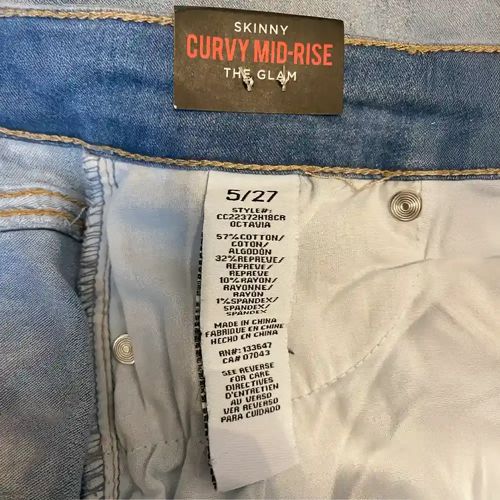 These Celebrity Pink skinny jeans from The Glam collection are designed specifically for curvy figures. The light blue wash features subtle whisker detailing at the thighs for a worn in look that feels effortless. Mid rise waist hits at a comfortable spot while the curvy fit provides extra room through the hip and thigh before tapering to a slim ankle. Made with Repreve recycled fibers for an eco conscious choice without sacrificing comfort or stretch. The skinny leg creates a streamlined silhouette that pairs well with everything from oversized sweaters to fitted tops. Five pocket styling with zip fly and button closure. Belt loops included for accessorizing. A versatile everyday jean that flatters your shape.