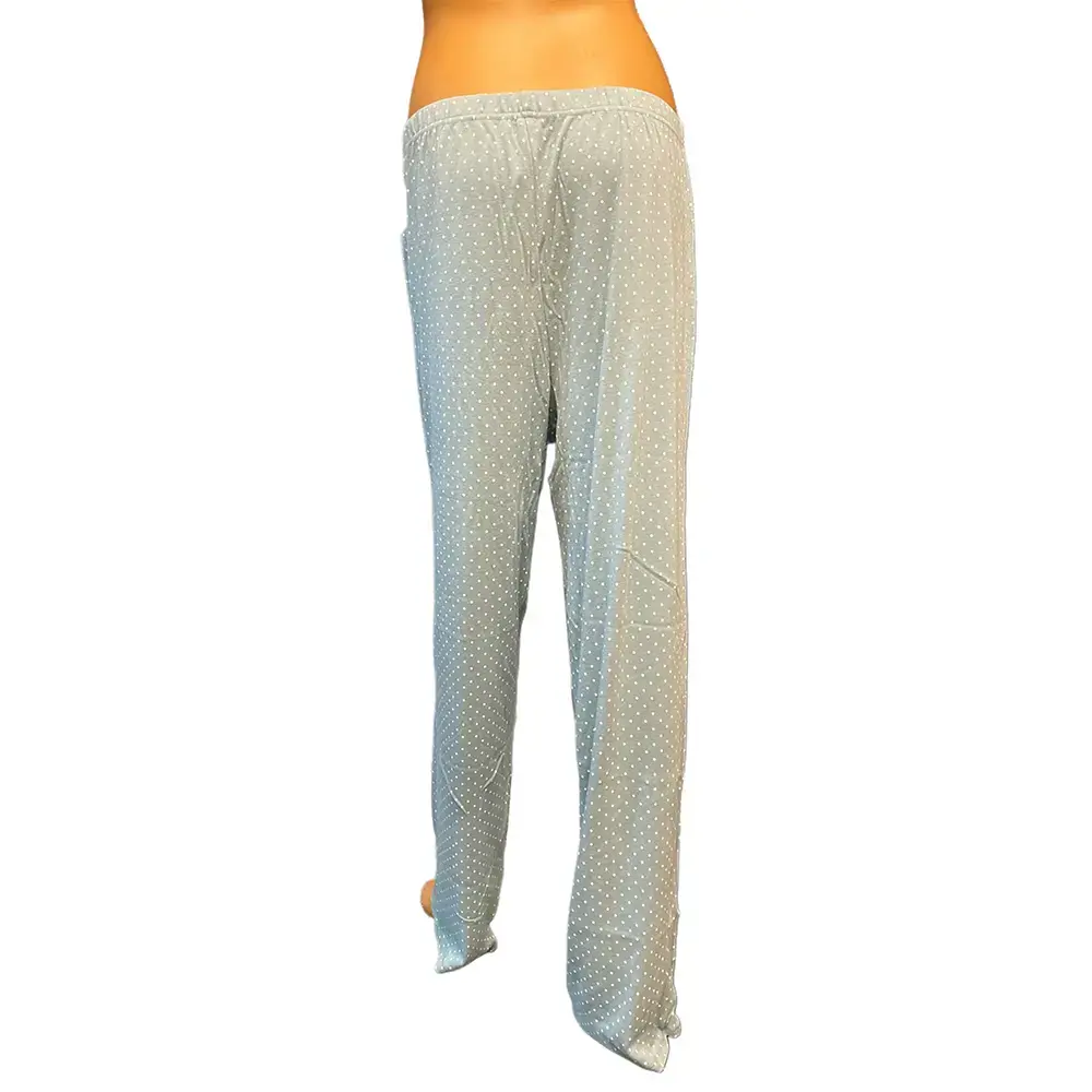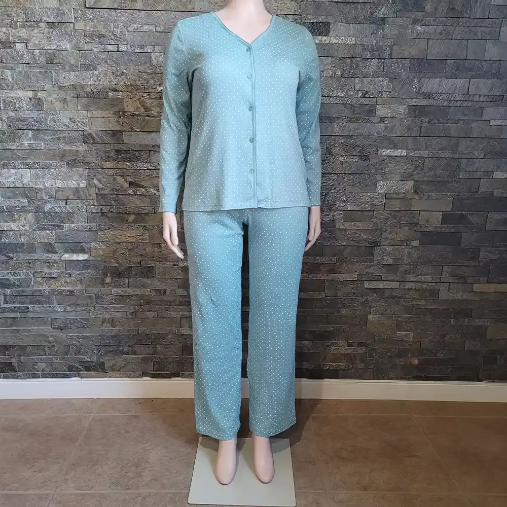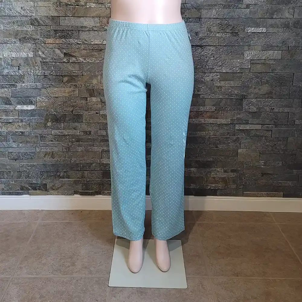 This Charter Club Intimates pajama set offers classic comfort in a cheerful polka dot print. The coordinating two piece set features a light blue background with white dots throughout. The top has a V neckline with lace trim, full button front closure, and long sleeves with delicate picot edge detail. Matching pants have a comfortable elastic waistband for easy pull on wear. Soft 100% cotton fabric feels breathable and cozy for a great night's sleep. OEKO TEX certified for quality and safety. New with tags, never worn.