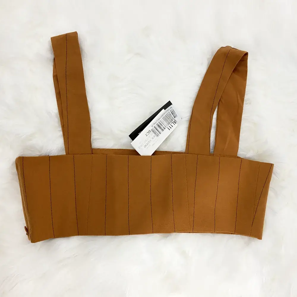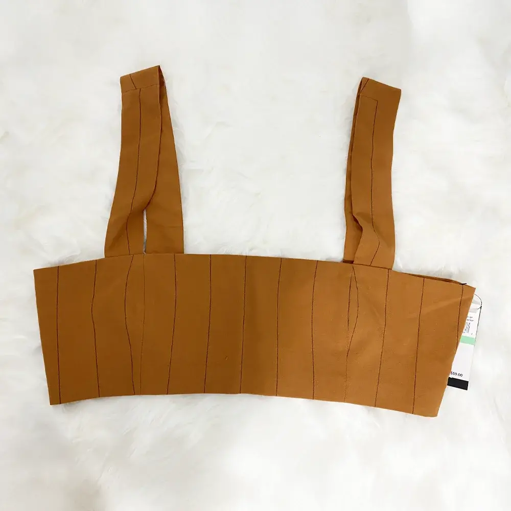 Make a statement with this gorgeous Danielle Bernstein crop top that's equal parts sophisticated and sexy. The rich caramel color is universally flattering and on-trend, while the vertical pintuck seaming creates a structured, corset-inspired look that sculpts and defines your silhouette. The square neckline and wide supportive straps offer a modern, balanced aesthetic, while the low scoop back adds an unexpected detail. Fully lined for comfort and coverage, this piece features a discreet side zipper closure for a seamless look. The cropped length hits right at the natural waist, making it perfect for pairing with high-waisted jeans, skirts, or trousers. Whether you're heading to brunch, a concert, date night, or a special event, this versatile top delivers contemporary style with a touch of vintage-inspired glamour. Brand new with tags attached and ready to turn heads.