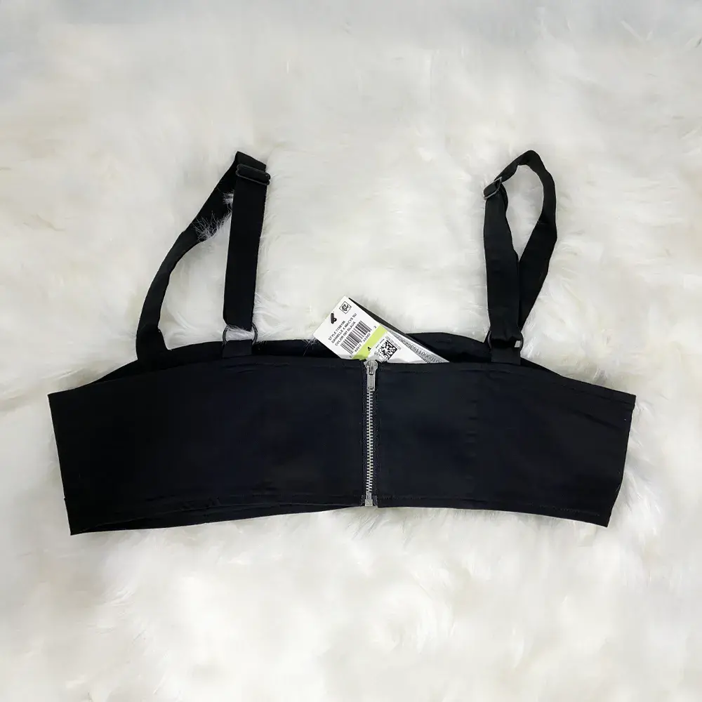 Elevate your basics with this versatile Danielle Bernstein bralette crop top in a gorgeous black shade. The minimalist design features a classic straight neckline that flatters every body type, while adjustable straps with rose gold hardware ensure the perfect fit. The soft cotton-blend fabric offers comfortable stretch and breathability, making this ideal for all-day wear. A discreet back zipper closure provides a smooth, seamless look from the front. The cropped length pairs perfectly with high-waisted bottoms, making it a wardrobe essential for layering under blazers and cardigans or wearing solo during warmer months. This piece transitions effortlessly from casual to dressy - wear it with jeans for a relaxed vibe or dress it up with a skirt for nights out. Brand new with tags and ready to become your new go-to staple.