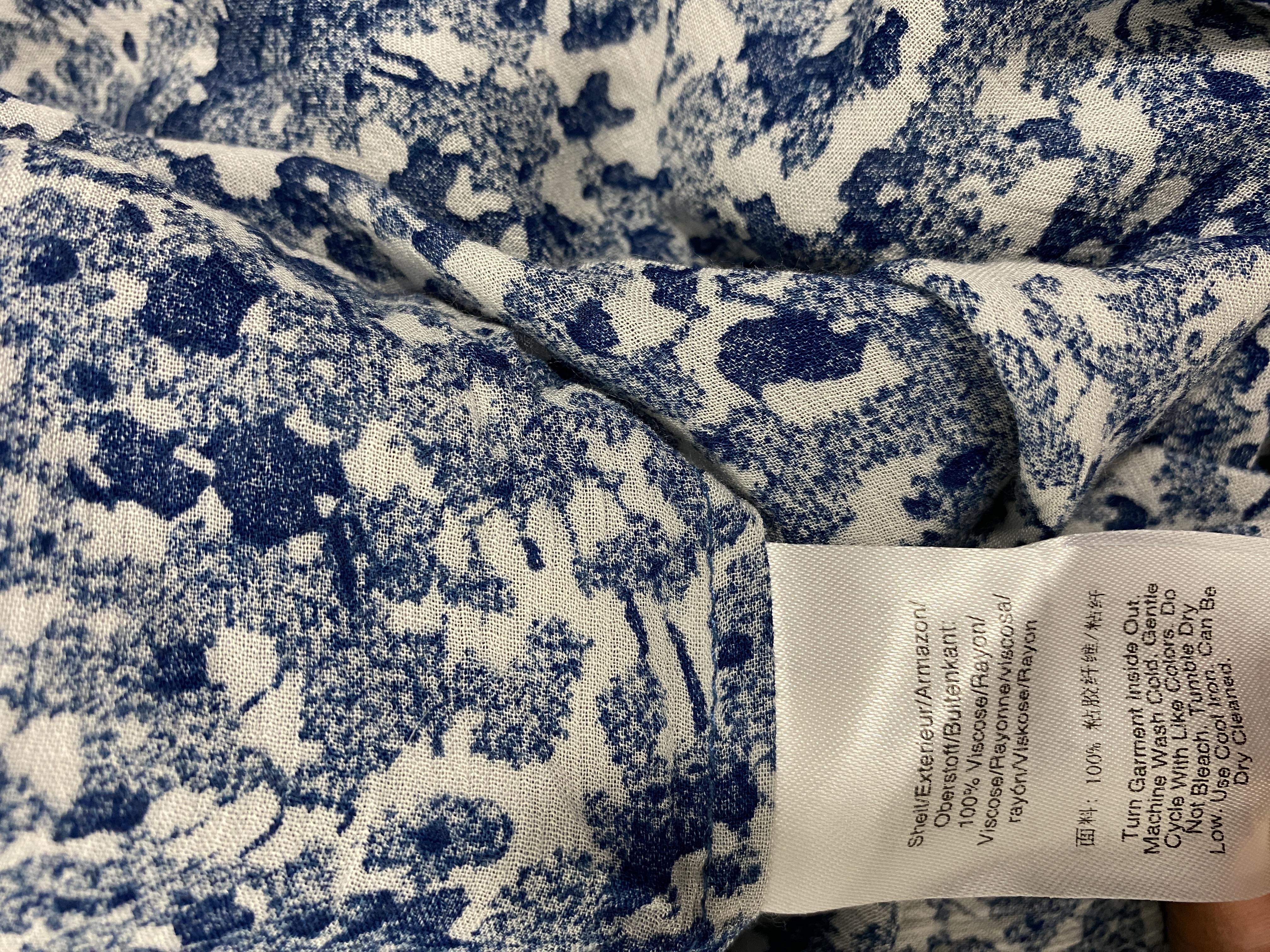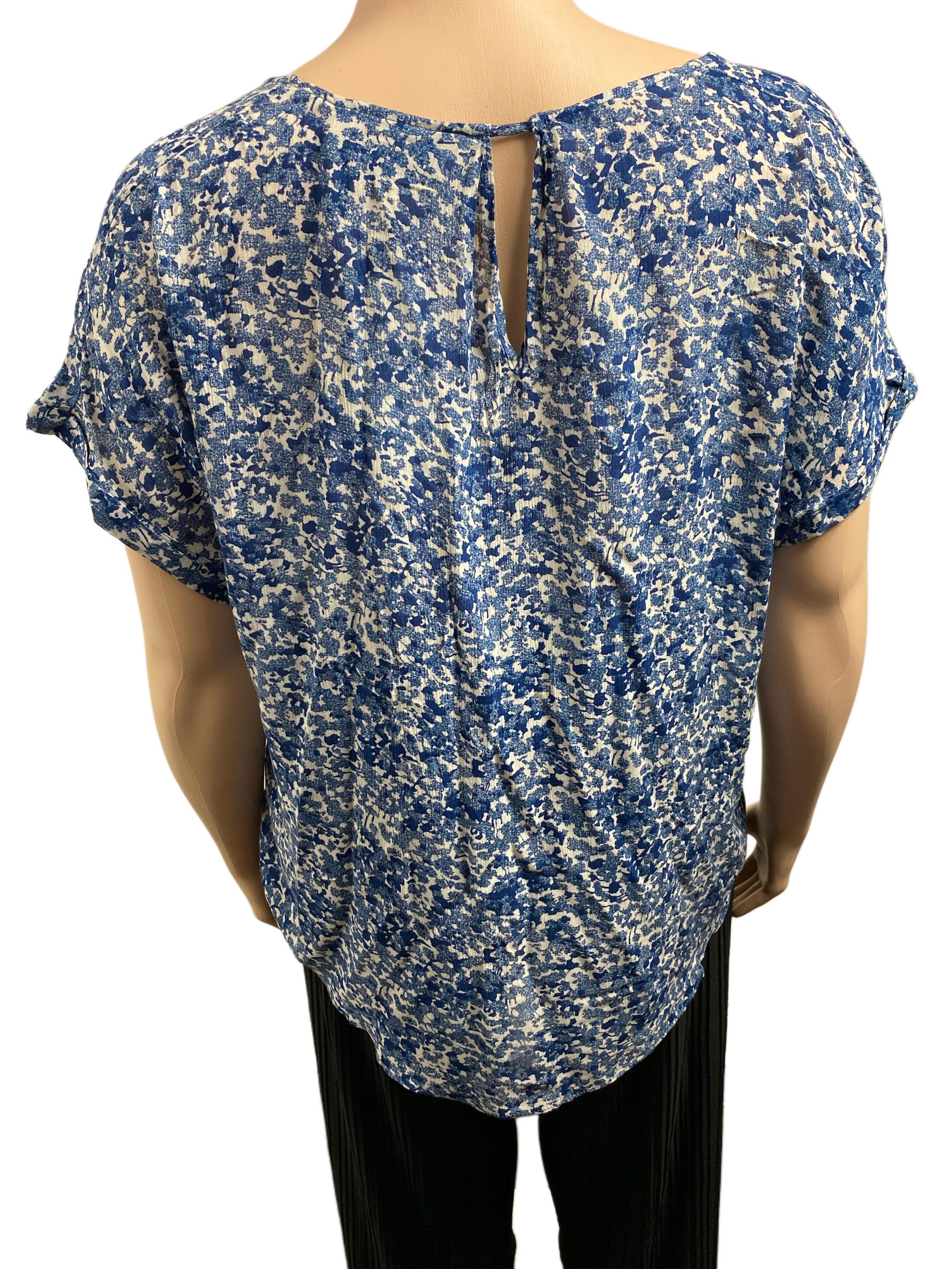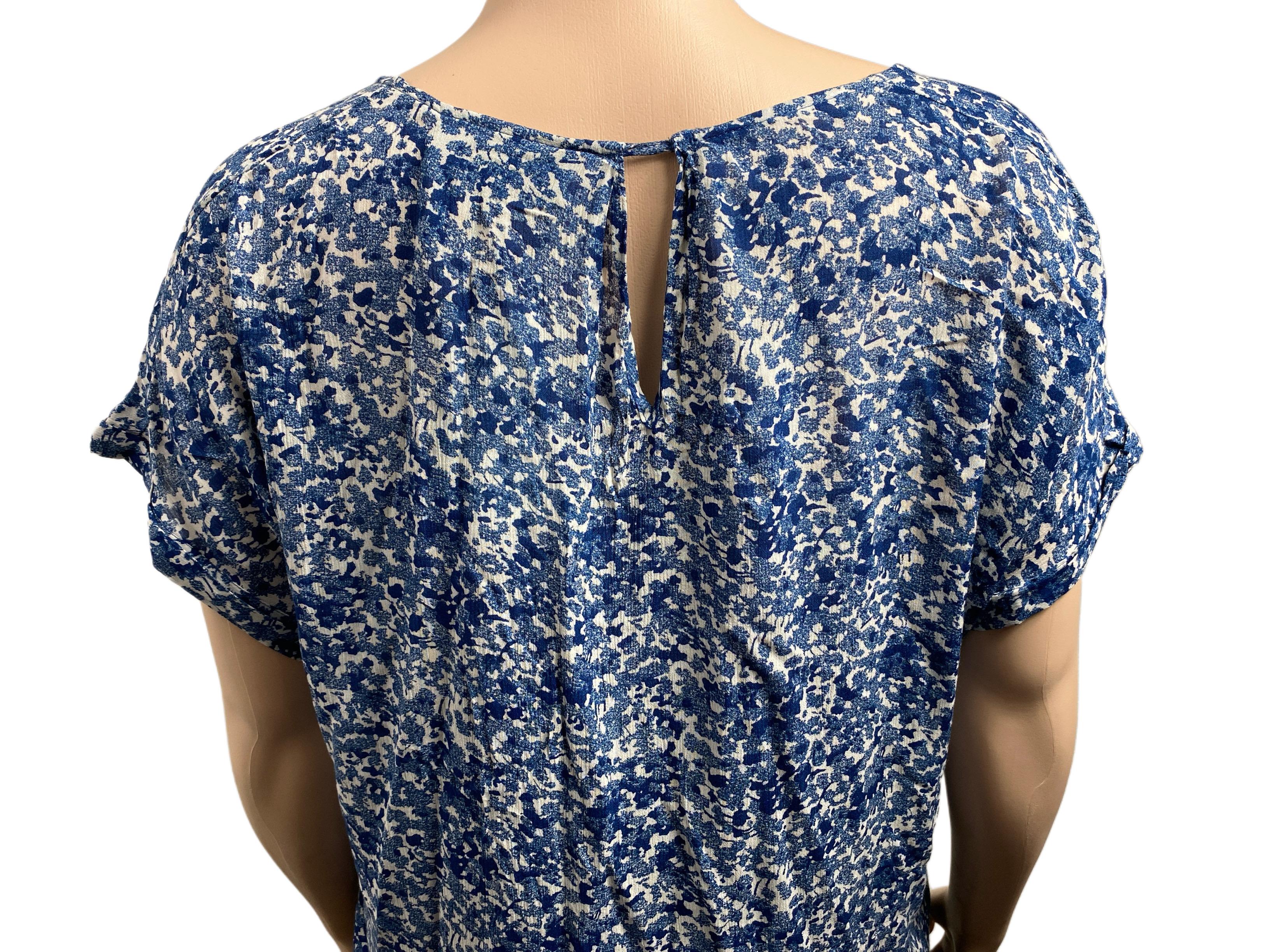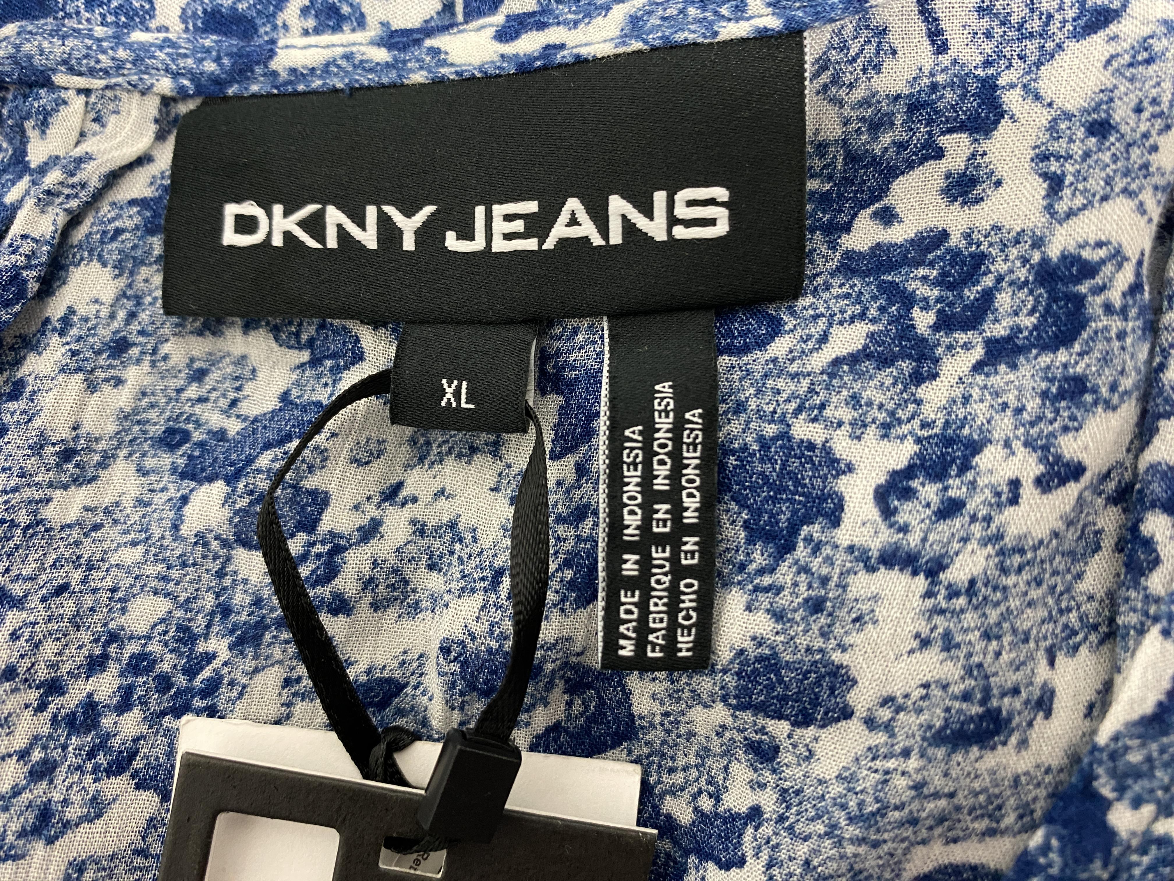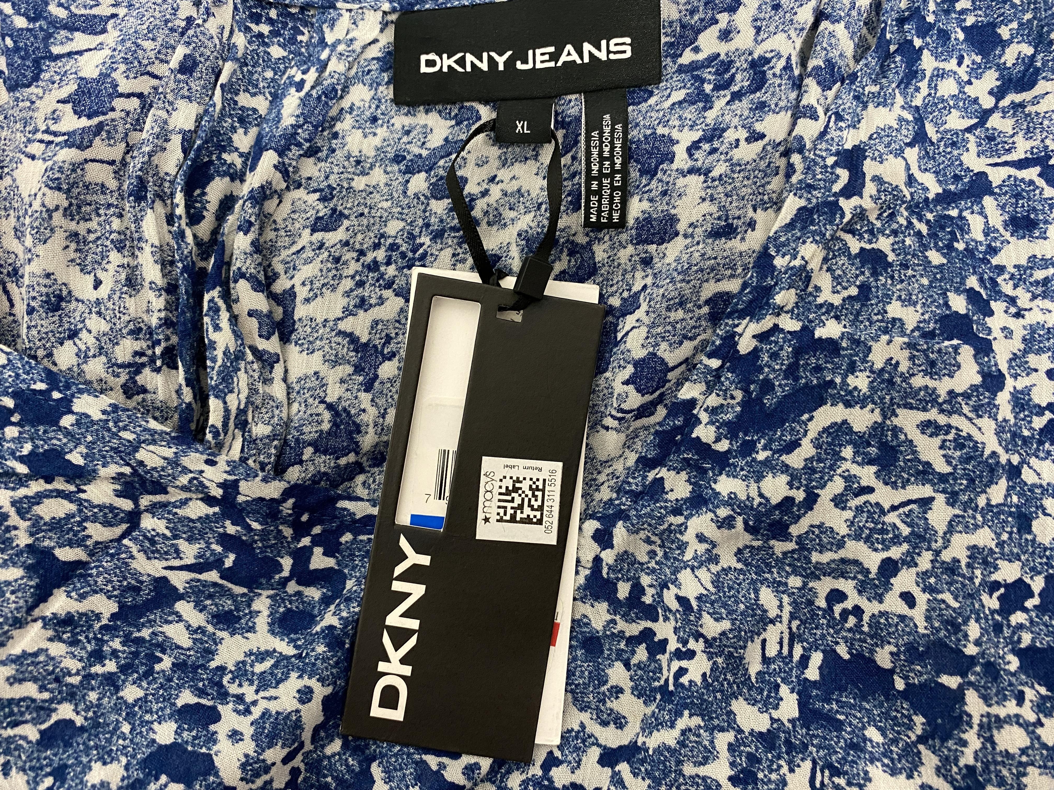 Add artistic flair to your wardrobe with this stunning DKNY Jeans top featuring an eye-catching abstract paint splatter print in rich blue and white. The flattering V-neckline creates an elegant silhouette, while the charming keyhole detail at the back adds an unexpected touch of sophistication. Crafted from 100% viscose, this top offers a luxuriously soft, drapey feel that moves beautifully with you. The relaxed fit and rolled short sleeves create an effortlessly stylish look perfect for casual days or dressed-up occasions. The abstract pattern adds visual interest and pairs easily with solid-colored bottoms. Versatile enough for the office, weekend brunch, or evening outings - simply style with jeans, trousers, or a skirt. Brand new with tags attached and ready to elevate your everyday style with DKNY's signature urban sophistication.