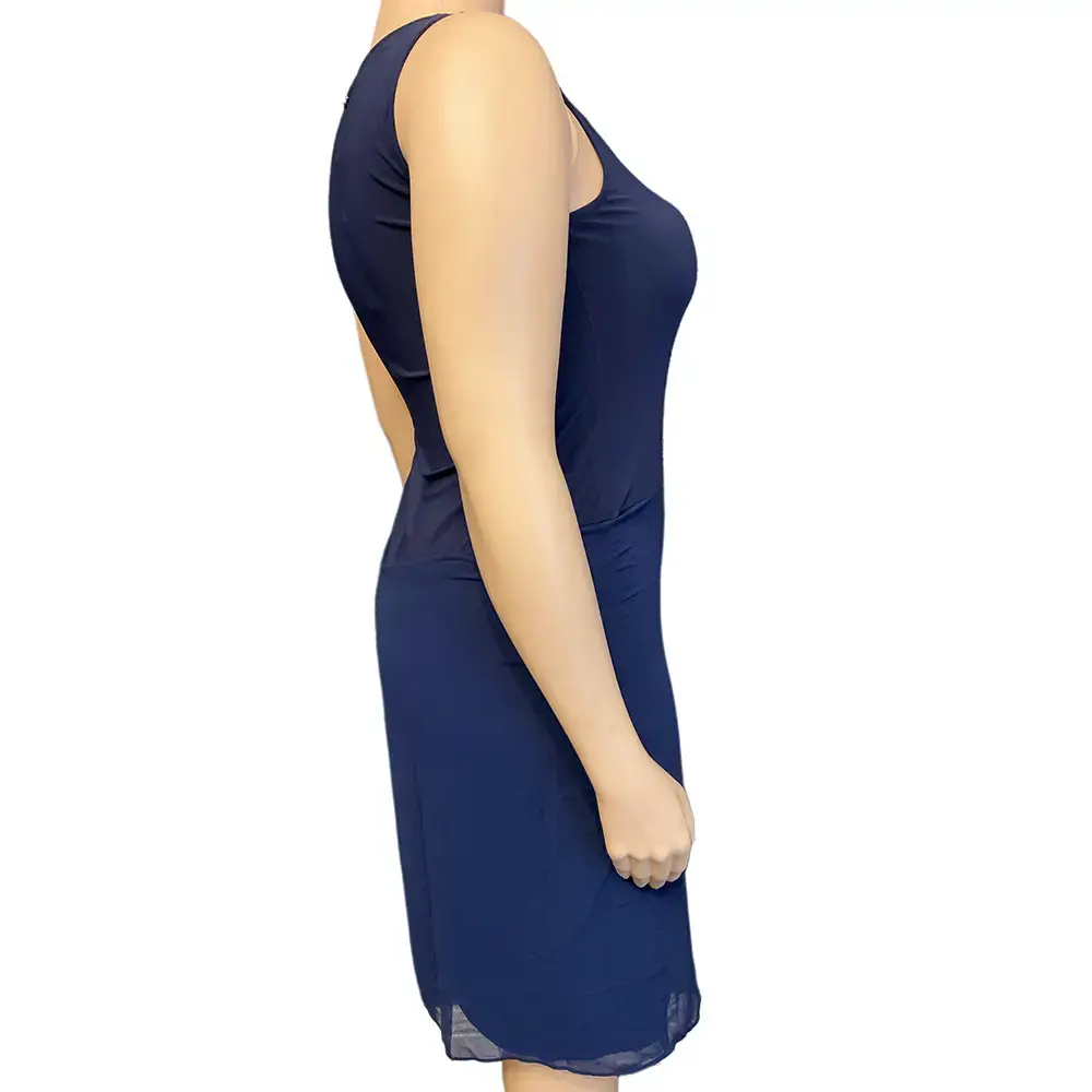 This stunning DKNY dress brings contemporary elegance with its unique asymmetric design. The sleek sleeveless bodice features a classic scoop neckline while stretch fabric ensures a comfortable, flattering fit. The standout feature is the dramatic asymmetric hemline where flowing sheer fabric cascades at an angle, creating beautiful movement and visual interest. Layered construction combines an opaque base with a lightweight sheer overlay at the skirt. Signature DKNY gold logo plate adds designer polish. The rich navy blue color works beautifully for daytime events or evening occasions. This versatile piece transitions effortlessly from office to dinner, casual gatherings to cocktail parties. Simply add heels and jewelry for instant sophistication. Brand new with original tags attached.