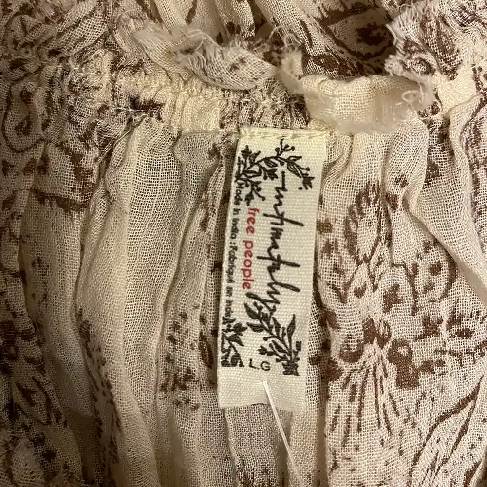 This Free People FP One mini dress is the ultimate boho piece. The cream gauze cotton is printed with an all-over brown paisley and floral pattern that feels vintage and effortless. The lace-up front neckline with button details adds a romantic touch, while the tie waist lets you adjust the fit. The tiered skirt has beautiful movement and the crinkle texture gives it that relaxed, lived-in feel. Slightly sheer and unlined, perfect layered over a slip or worn as a nightie. New with original Free People tags still attached.