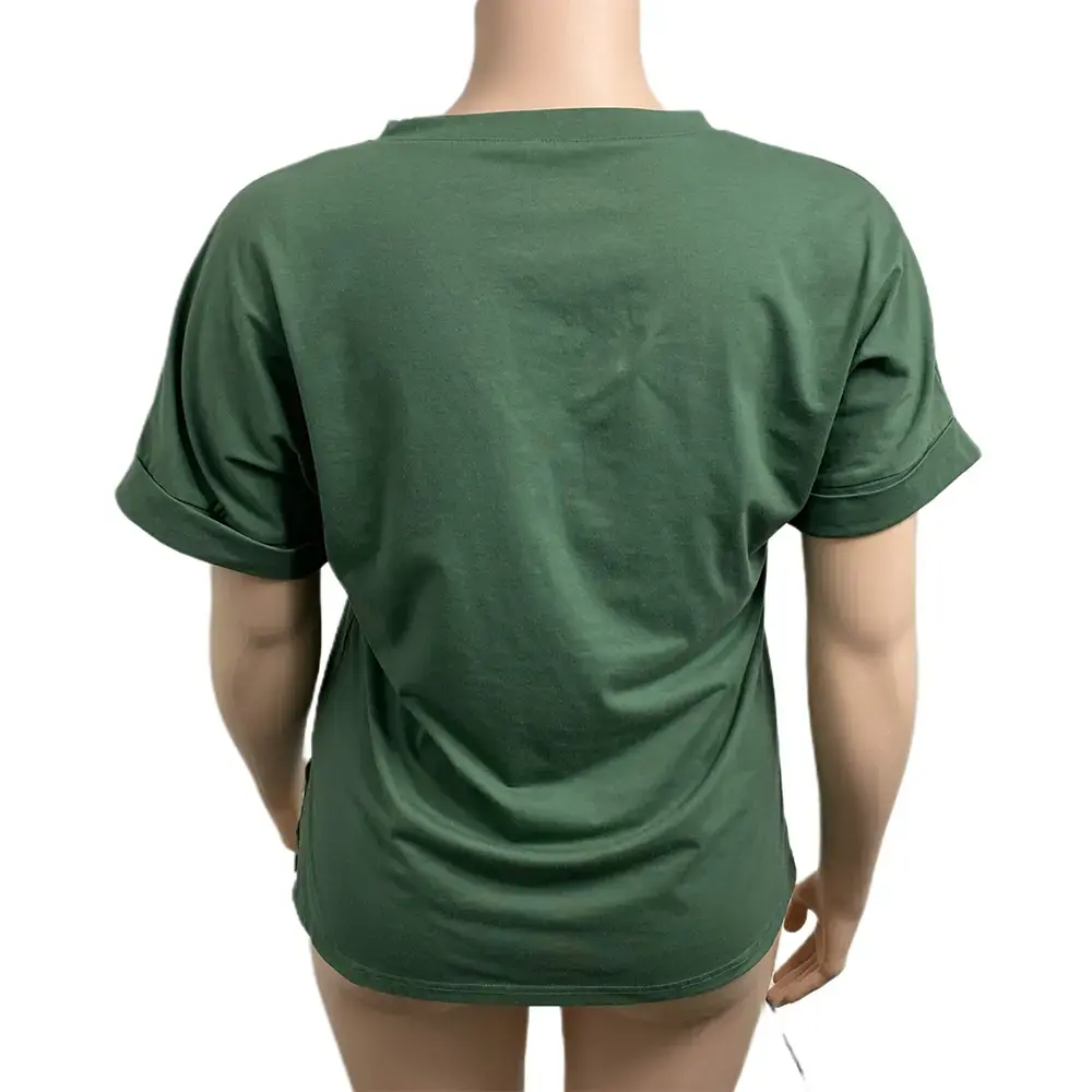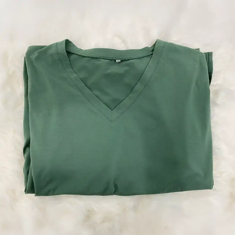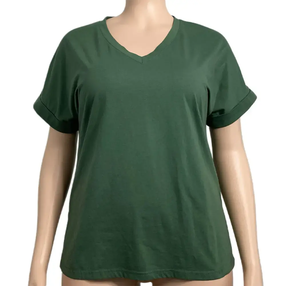 This solid green tee is one of those easy basics that works with just about everything. The sage green color is versatile enough to pair with denim, khakis, or casual pants. The V-neckline sits at a comfortable depth, and the short sleeves come with a rolled cuff that adds a bit of style to an otherwise straightforward shirt.
