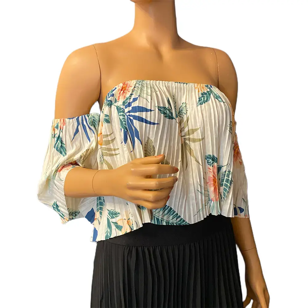 This GUESS top is giving vacation energy. The allover pleated fabric creates beautiful movement and texture, while the off shoulder neckline shows just the right amount of skin. The Hanalei Blooms print features soft coral hibiscus flowers and palm fronds on a cream background for that effortless tropical look. Flutter sleeves and a relaxed cropped silhouette keep it breezy and feminine.