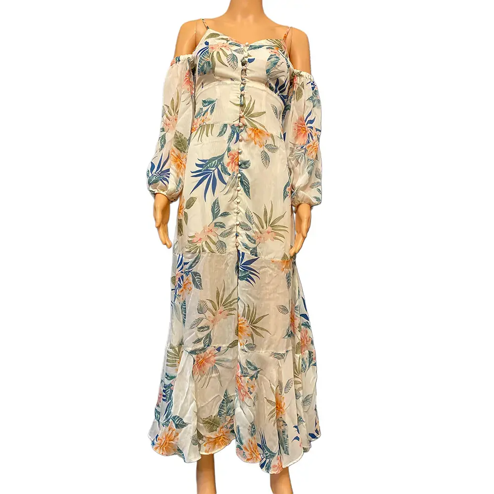 This GUESS maxi dress has that effortless vacation vibe. The tropical floral print in coral, orange, and blue pops against the cream background, while the cold shoulder sleeves and spaghetti straps keep it feminine and flirty. The button front adds visual interest without being fussy, and the front slit gives you room to move. Built in slip means no extra layering needed. Perfect for beach days, brunch, or anywhere you want to feel put together but relaxed.