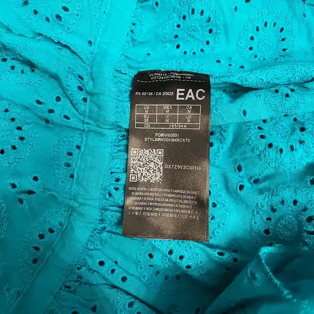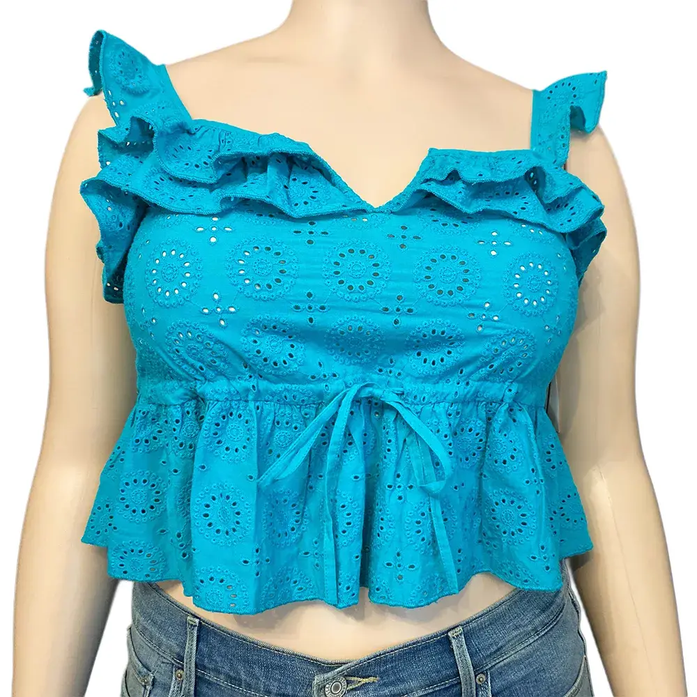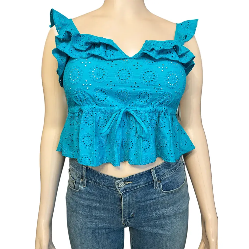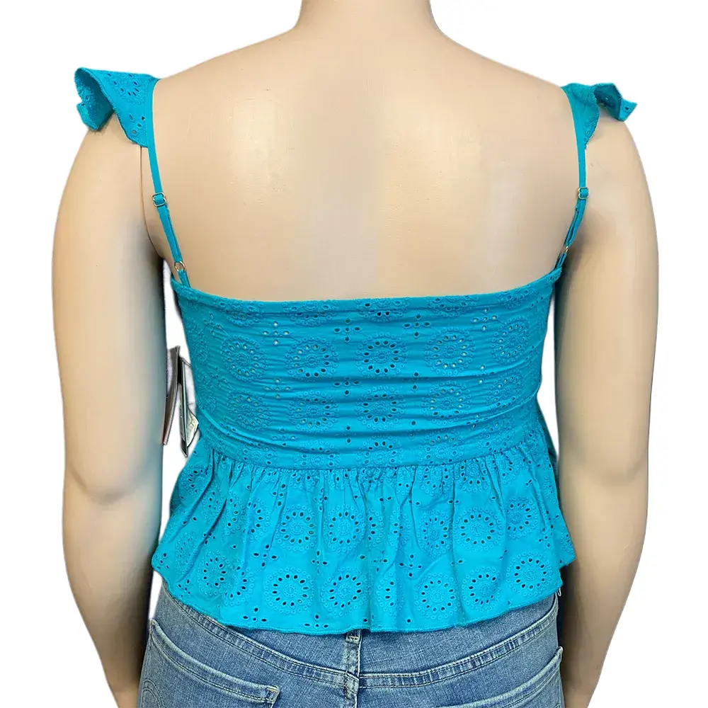 This Guess Nuala top brings summer charm with its beautiful eyelet broderie anglaise fabric. The bright teal color pops perfectly for warm weather styling. Delicate circular eyelet pattern adds texture and visual interest throughout. Ruffle trim frames the V neckline and continues along the straps for romantic detail. Fitted bodice features a wide smocked back panel that stretches for comfortable fit and easy pull on styling. Adjustable straps let you customize the fit. Front drawstring tie at the waist cinches to define your shape while the gathered peplum hem flares out for flirty movement. Crop length pairs perfectly with high waisted jeans, shorts, or skirts. The coastal vibe makes this ideal for beach days, vacation wear, or casual summer outings. Brand new with original tags attached.