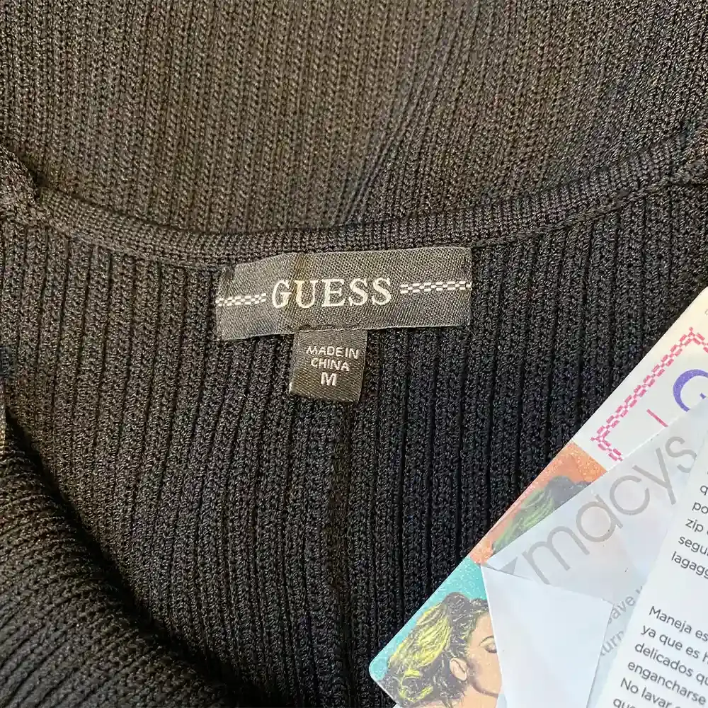Sleek black ribbed midi dress from Guess in classic bodycon silhouette. Deep V neckline with wide straps and sexy low back creates modern appeal. Stretchy knit fabric hugs curves while waist detailing adds shape. Brand new with tags.
