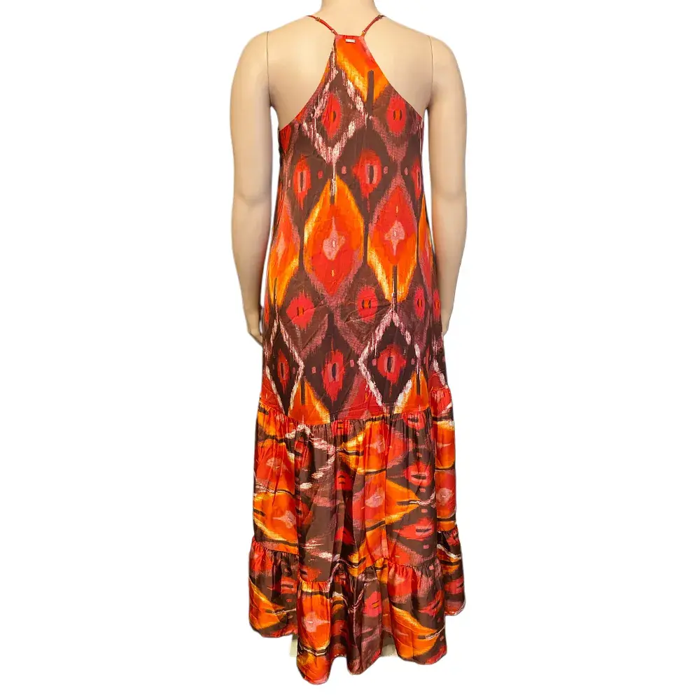 This stunning Guess Angelica maxi dress brings festival-ready style with its eye-catching ikat-inspired print. Rich shades of orange, red, brown, pink, and mauve create a dramatic diamond pattern throughout. The flattering halter neckline frames the shoulders beautifully while adjustable ties at the back offer a custom fit. A delicate keyhole cutout at the upper back adds a flirty touch. The flowing silhouette features two tiered ruffles that create gorgeous movement and a relaxed bohemian vibe. Lightweight fabric drapes effortlessly and keeps you comfortable all day. Perfect for beach vacations, summer festivals, tropical getaways, or any occasion where you want to make a colorful statement. Style with gladiator sandals and layered jewelry for ultimate boho chic. Brand new with original tags attached.