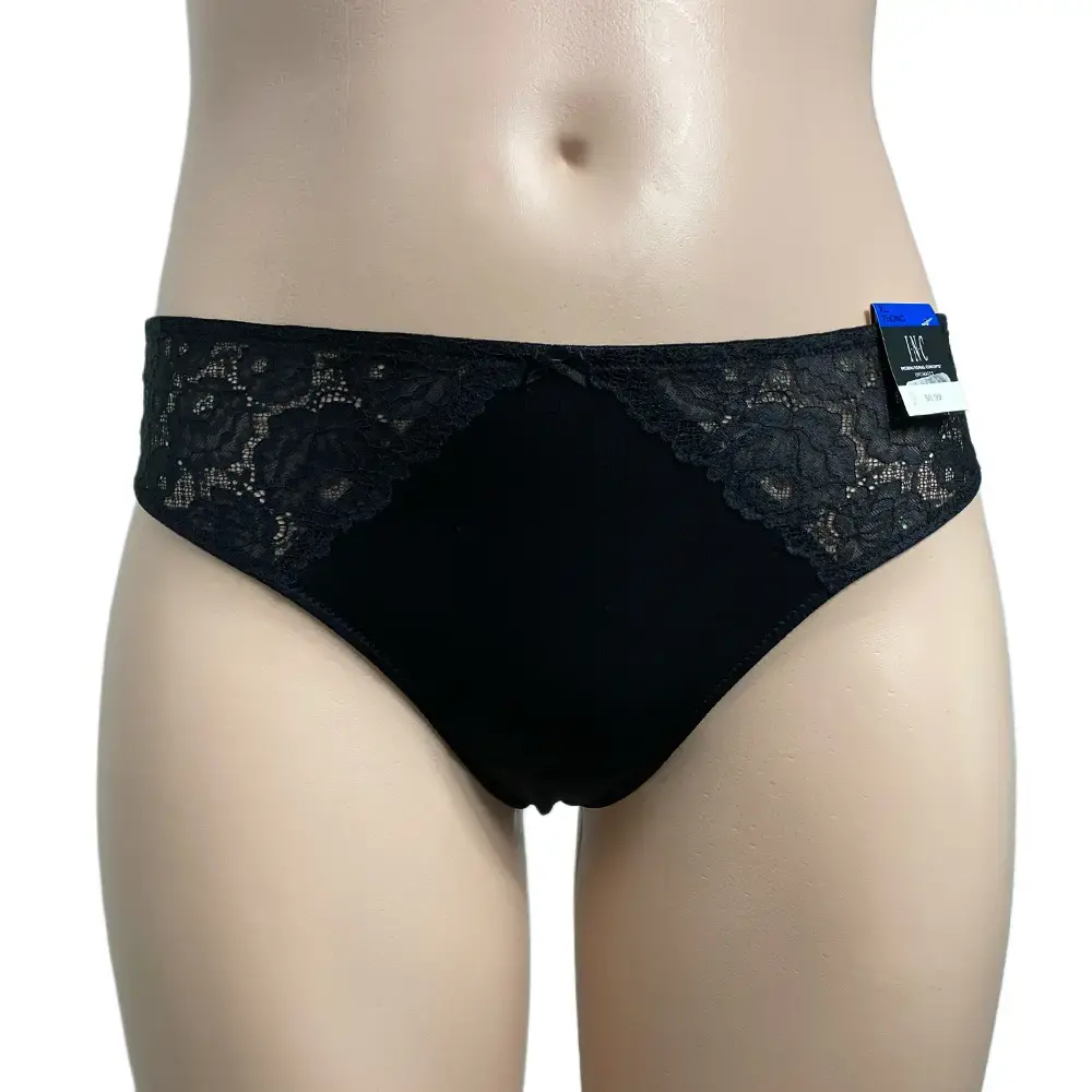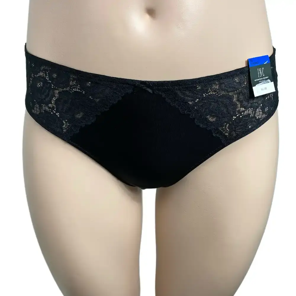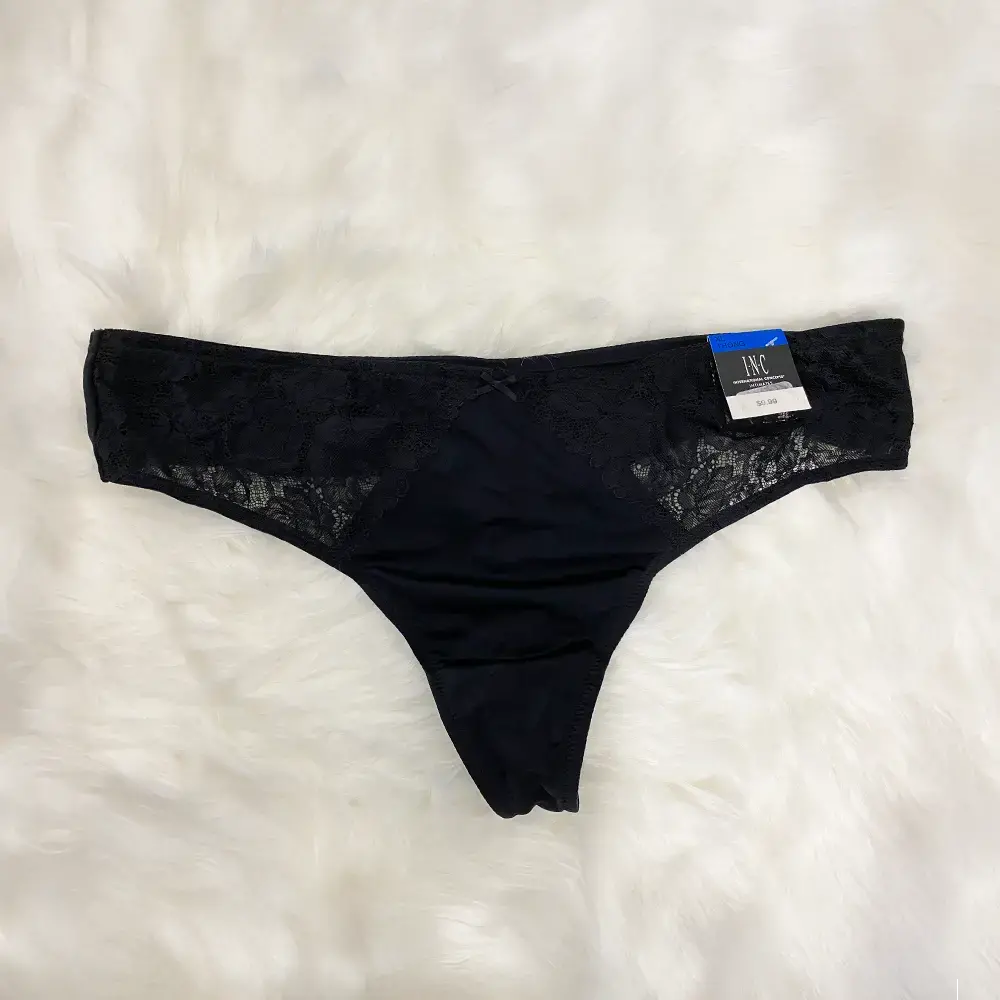 Add timeless elegance to your intimate apparel collection with this INC International Concepts black thong. The front features a smooth, seamless nylon construction while the sides showcase beautiful decorative lace detailing. The thong silhouette provides minimal coverage for a sleek and seamless look under clothing. The classic black color is versatile and works with any outfit. The nylon and spandex blend creates a stretchy, comfortable fabric that moves with your body. This is a reliable piece that works perfectly in your rotation of everyday intimate wear. The lace accents add just the right amount of elegance and sophistication. New with the original tag still attached.