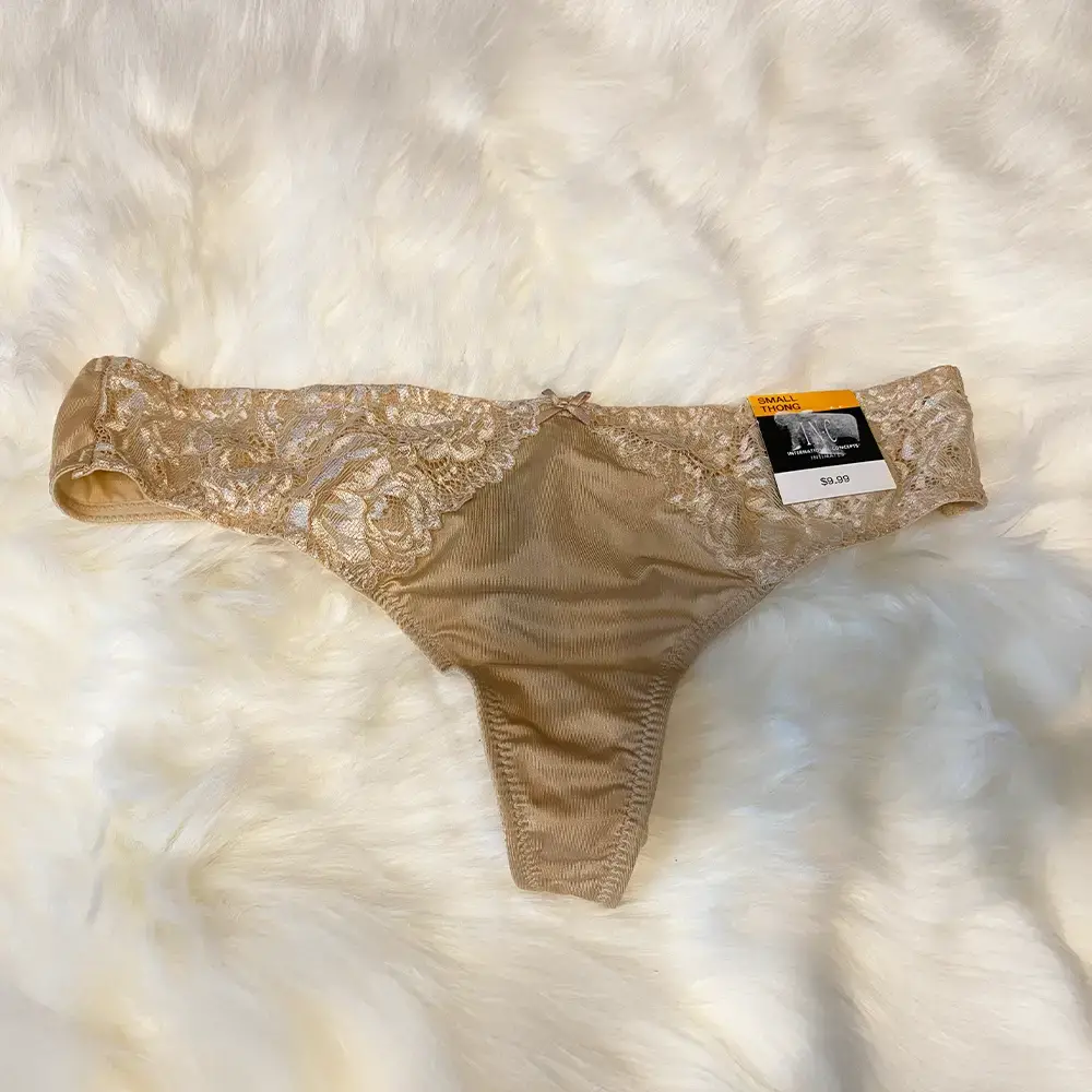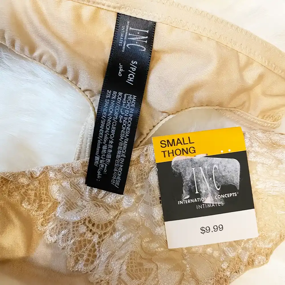 Add warmth and sophistication to your intimate apparel collection with this INC International Concepts frappe thong. The front features a smooth, seamless nylon construction while the sides showcase beautiful decorative lace detailing. The thong silhouette provides minimal coverage for a sleek and seamless look under clothing. The warm frappe color is flattering and versatile. The nylon and spandex blend creates a stretchy, comfortable fabric that moves with your body. This is a reliable piece that works perfectly in your rotation of everyday intimate wear. The lace accents add just the right amount of elegance and sophistication. New with the original tag still attached.