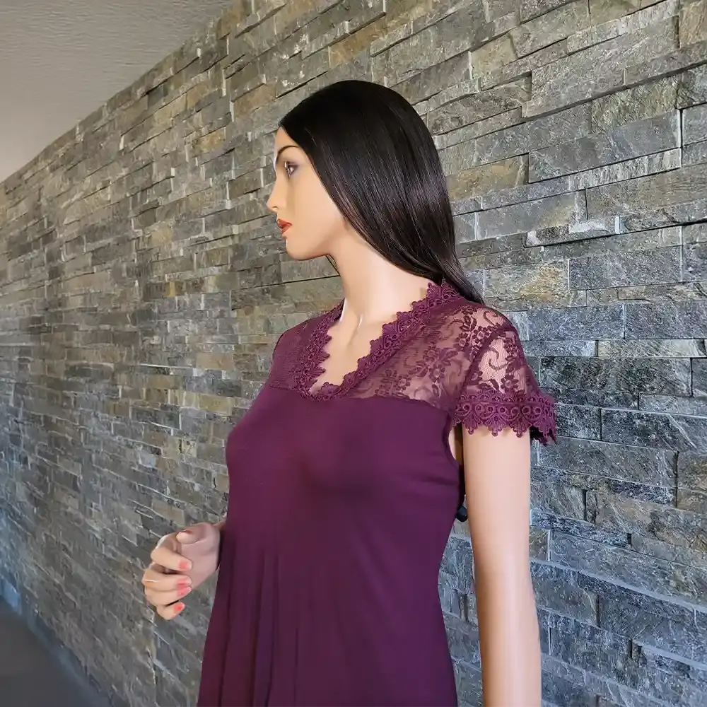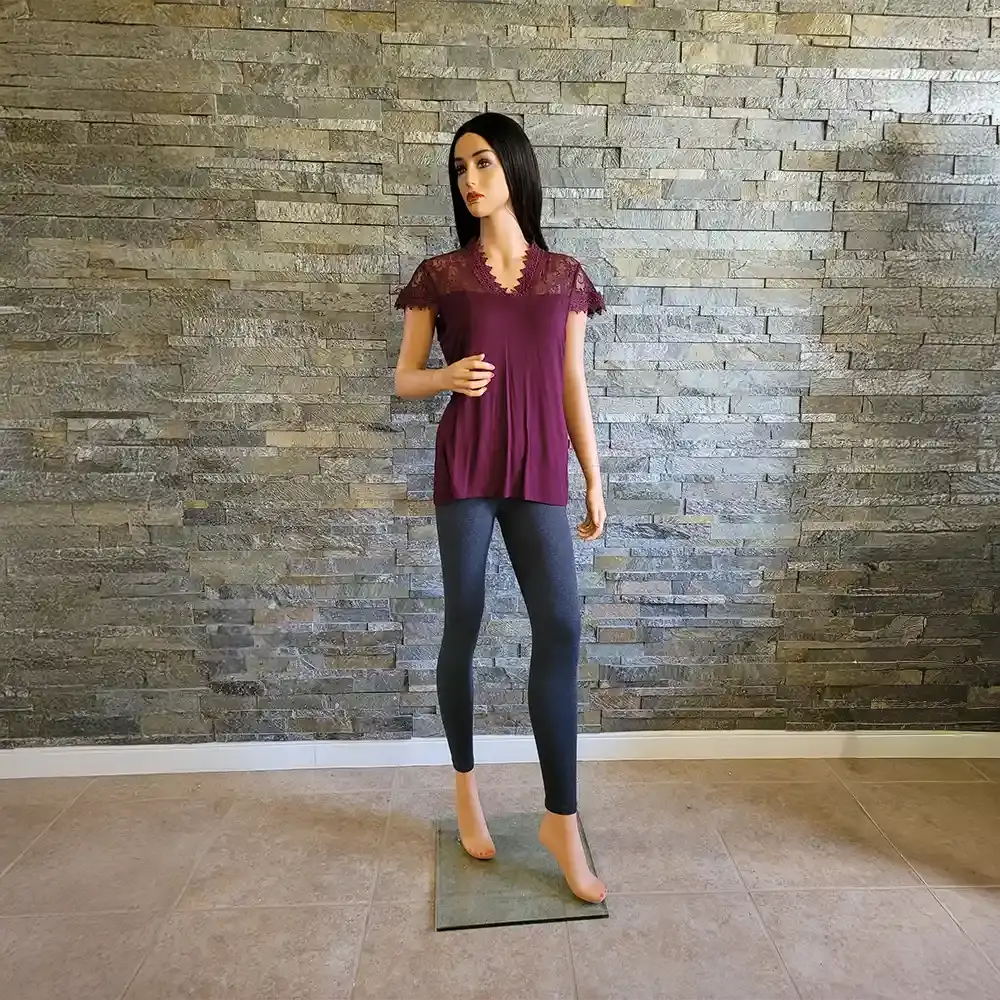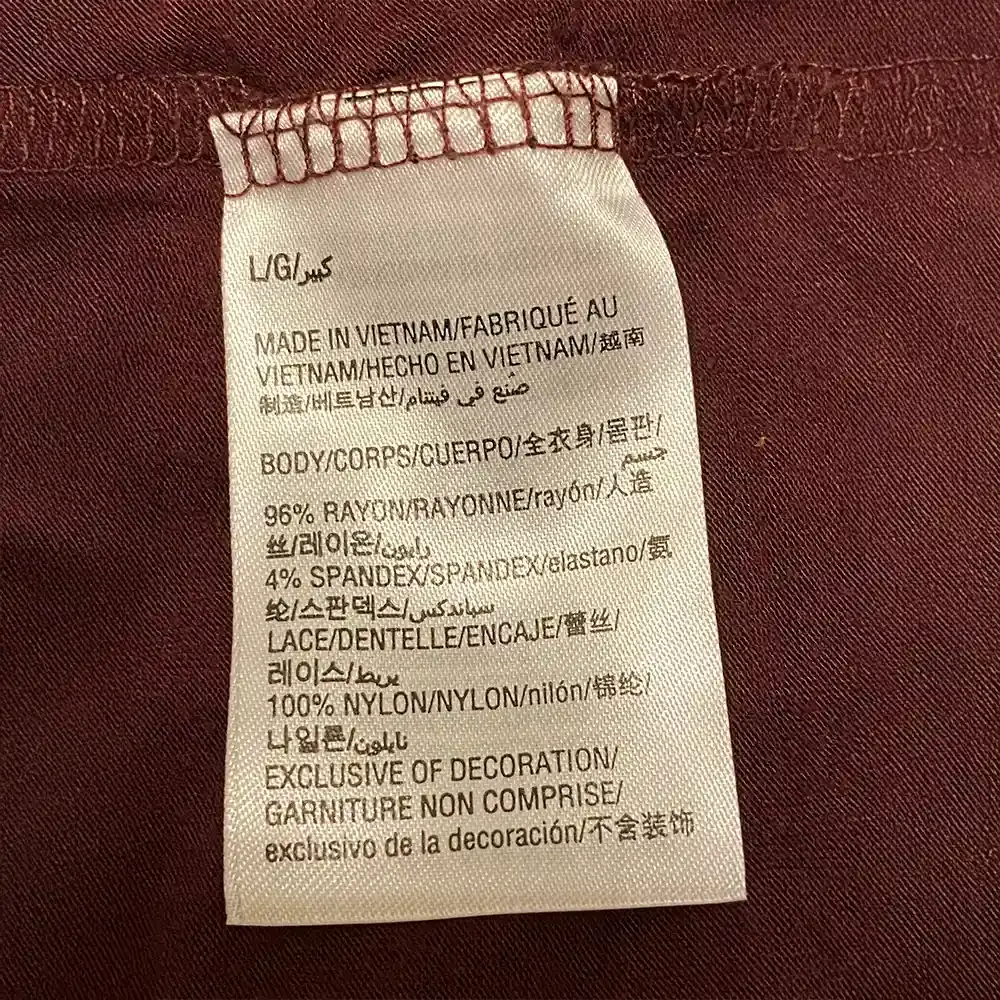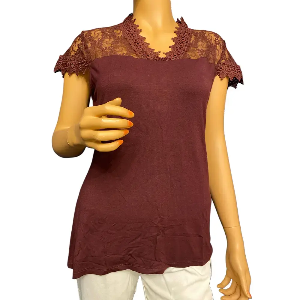 This top has all the right details. The lace yoke and cap sleeves add a romantic touch while the soft rayon blend body keeps it comfortable. V-neckline in front with a keyhole and button closure at the back. The burgundy color is perfect for fall or a night out. Store return in excellent condition with no flaws.