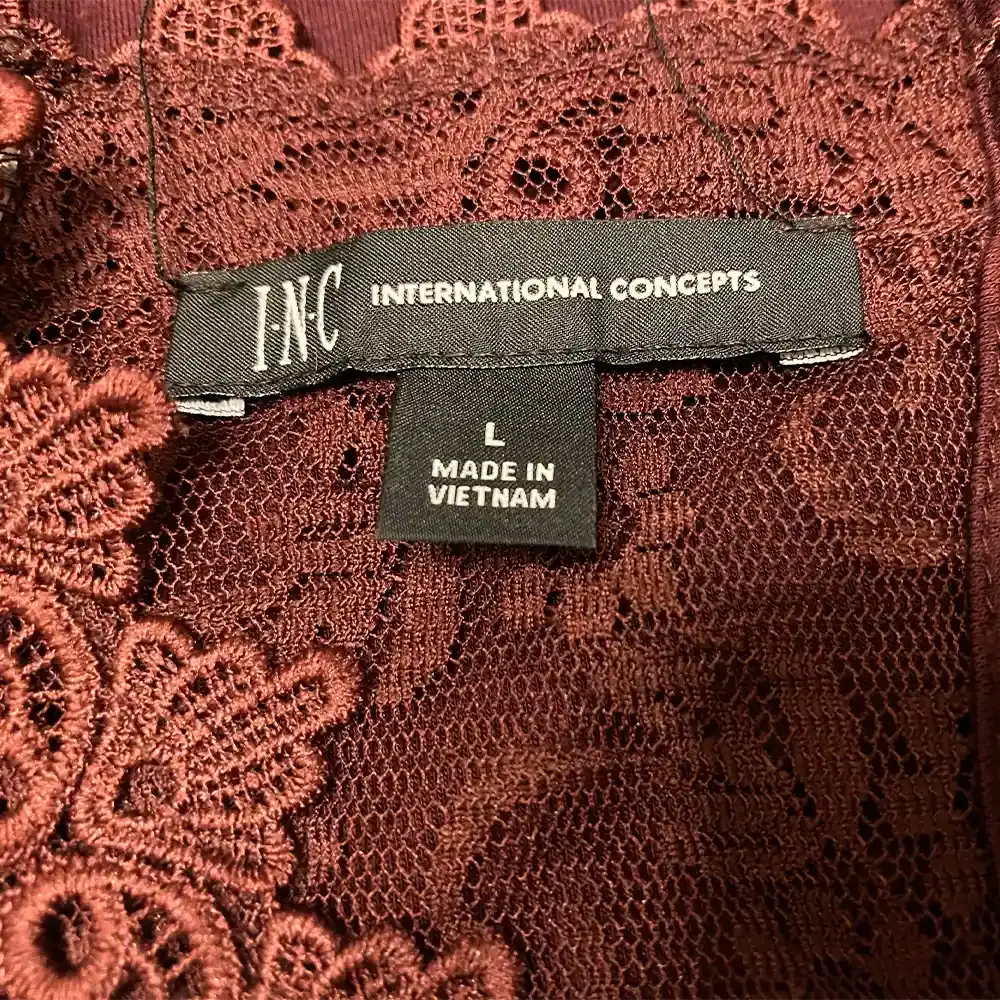Feminine top from INC International Concepts with lace yoke and cap sleeves. Soft rayon blend in a rich burgundy color. Size Large. Excellent condition.