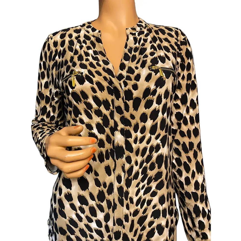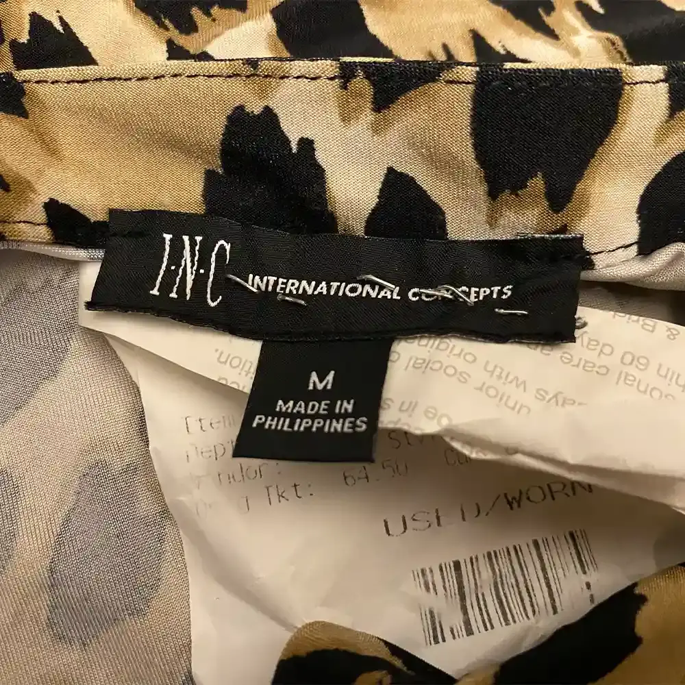 Bold INC International Concepts top featuring striking leopard print in tan, cream, and black. Modern split neckline with gold zipper pocket details at the chest adds edgy appeal. Fitted silhouette in stretchy fabric for comfortable all day wear. Pre owned in excellent condition.