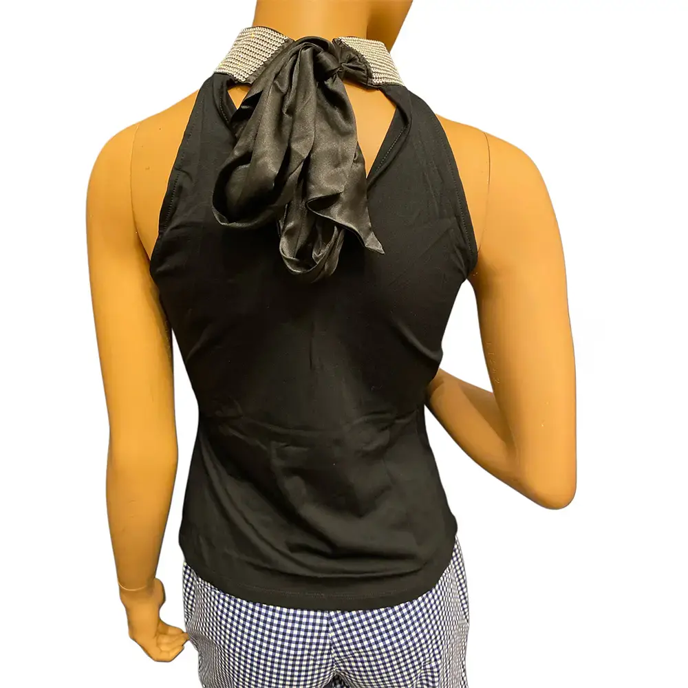 This top is made to turn heads. The rhinestone collar with dangling crystal fringe does all the talking while the sleek black body keeps it chic. Sleeveless with a flattering fit and a tie closure at the back neck. Soft stretch fabric feels great on. Perfect for a night out or any event where you want to shine. New with tags attached.