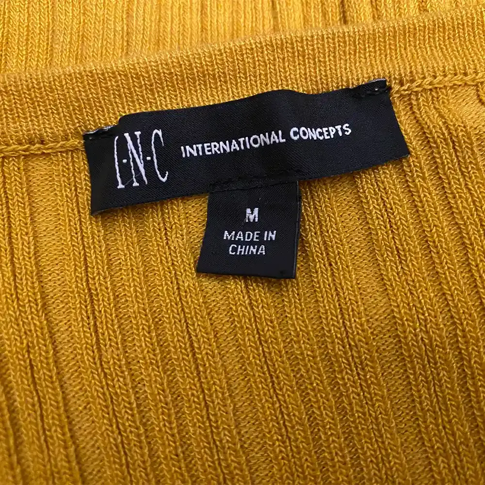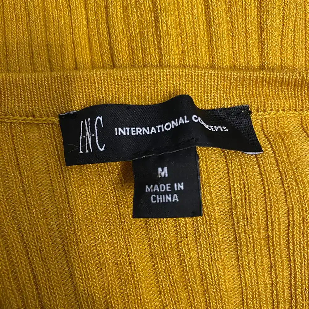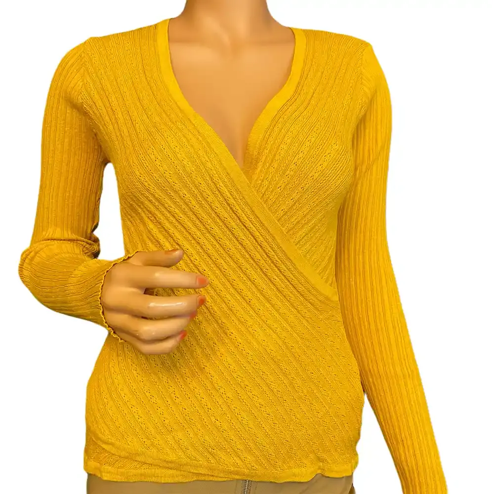 This INC International Concepts sweater brings warmth and style together in one polished piece. The faux wrap design crosses at the front creating a flattering V neckline that elongates the neckline. Ribbed knit texture runs throughout the body and sleeves adding visual interest and dimension. The gold dust color offers a rich mustard tone that transitions beautifully between seasons. Long sleeves with ribbed cuffs keep the look streamlined. Fitted silhouette follows your shape without being too tight. Lightweight knit fabric feels soft against the skin and drapes nicely. Perfect for layering under blazers at work or wearing alone for casual outings. Pairs well with jeans, trousers, or skirts for endless styling options.