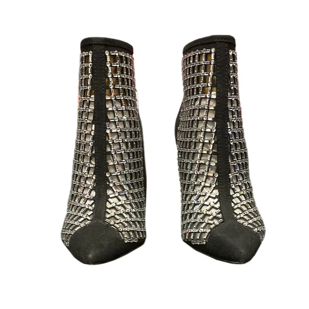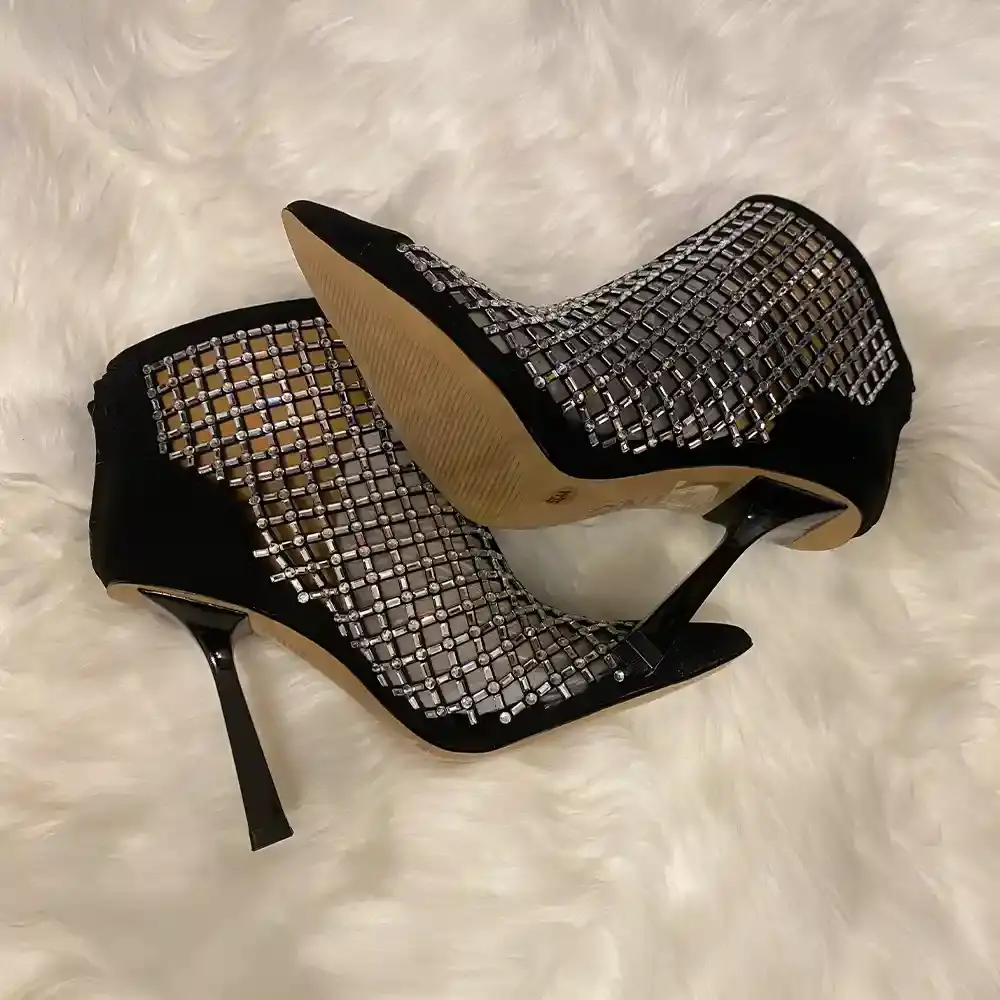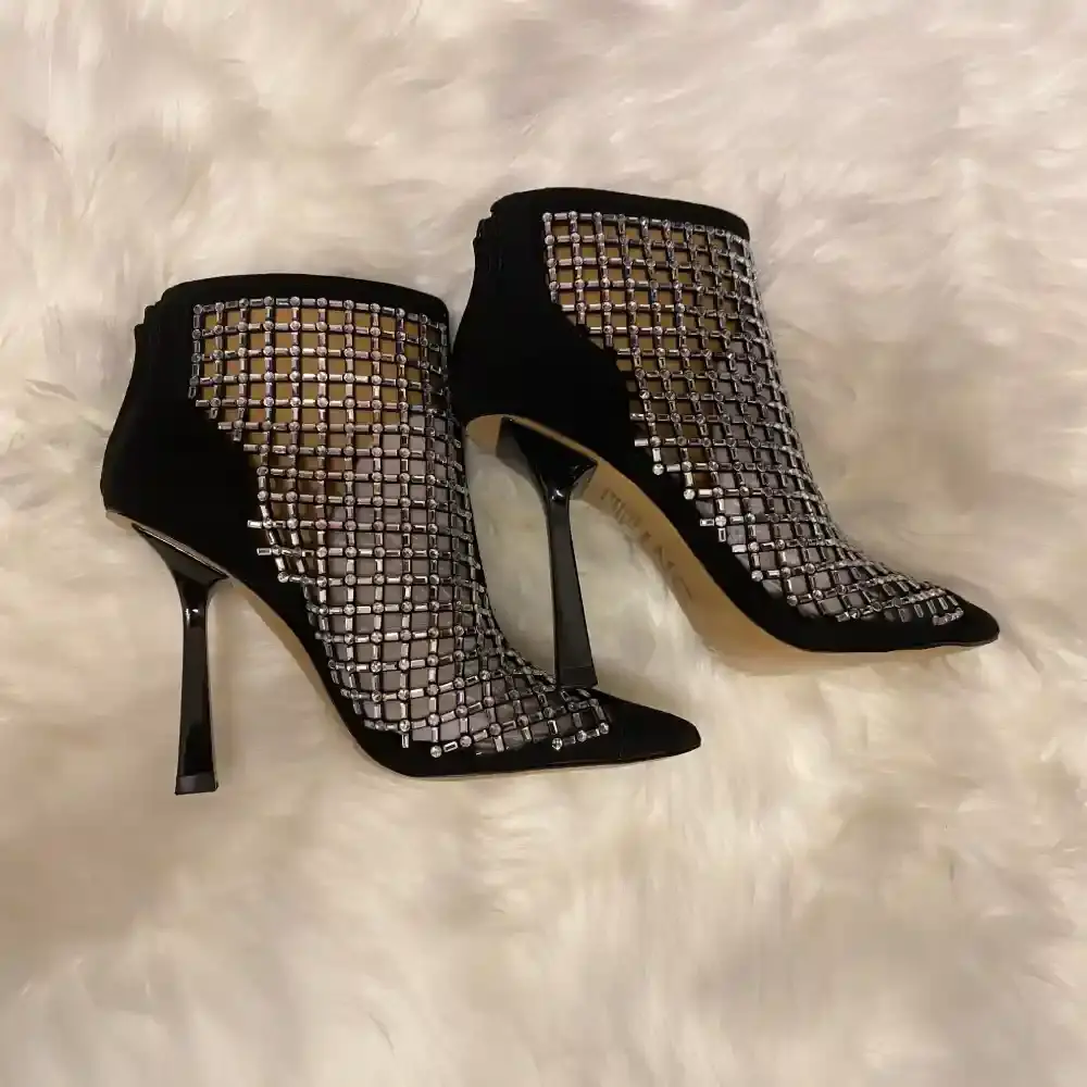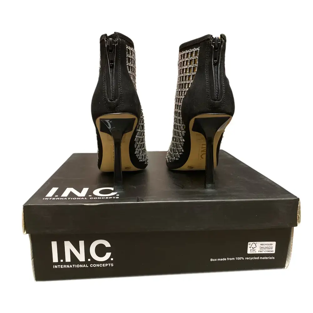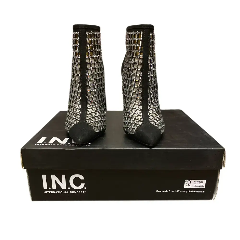 These INC International Concepts Senalda booties are made for a night out. The showstopping design features a sheer mesh upper covered in a grid of hot fix rhinestones that catch the light from every angle. Black microfiber trim at the pointed toe, heel counter, and ankle opening keeps the look sleek. Slim stiletto heel with a sculptural flare at the base adds extra drama. Back zipper for easy on and off. Brand new with box, never worn, soles are clean.
