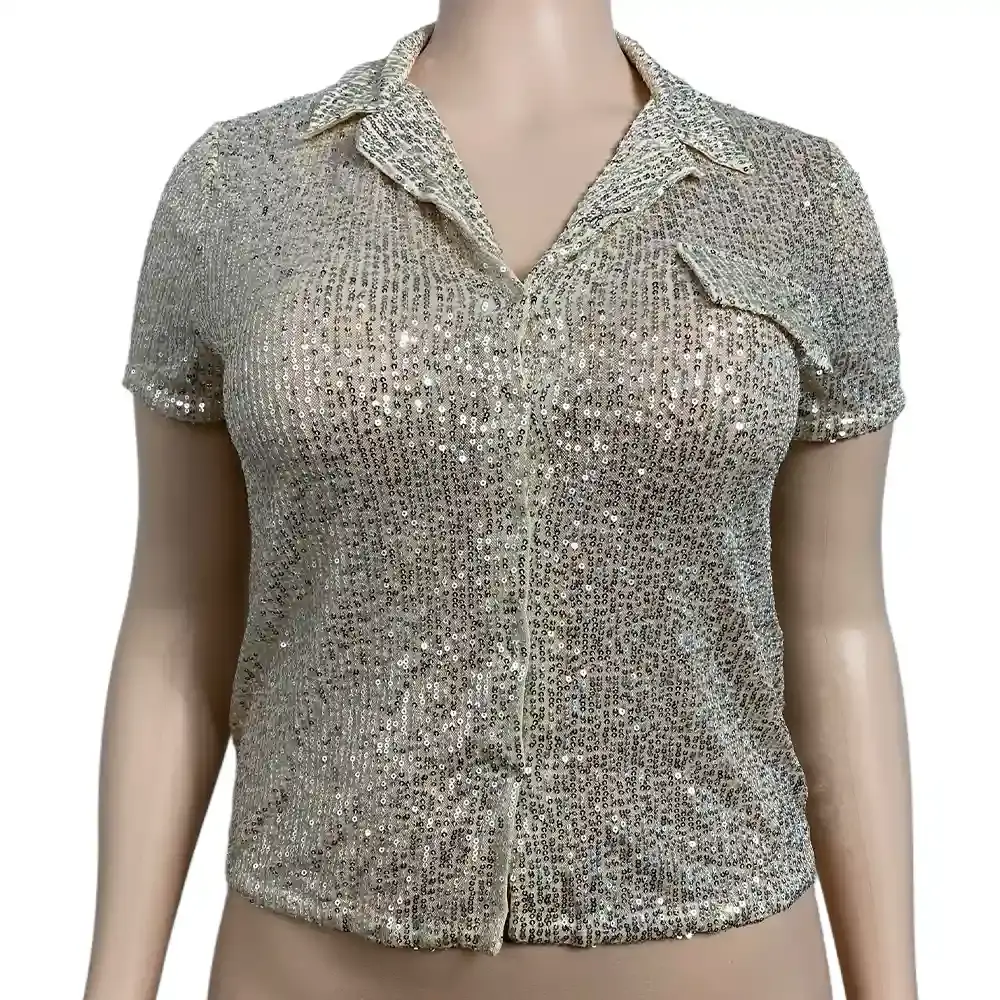 The cropped length hits right at the waist, so it pairs well with high-waisted pants or skirts. The sequins are dense enough to make a statement but the fabric has stretch (5% spandex), so you're not stuck in a stiff, uncomfortable shell all night. This is the kind of top you pull out when you want to look put-together without overthinking it.